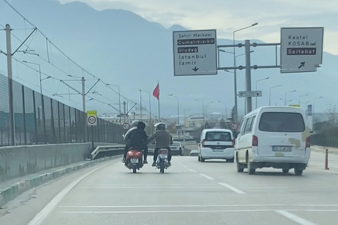 Olay Bursa-Ankara karayolu üzeri Kestel ilçesi mevkiinde meydana geldi. Kestel'den Gürsu istikametine seyreden 2 motosiklet sürücüsü, birbirine elleriyle temas ederek uzun süre seyrettiler. O anlar bir sürücünün amatör kamerasına saniye saniye yansıdı.