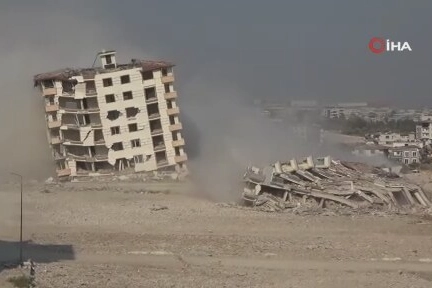Kahramanmaraş merkezli depremlerde ağır hasar alan Hatay’da hasarlı binaların yıkımları ve enkaz kaldırma çalışmaları devam ediyor. Enkaz kent Antakya’da yıkım işlemlerini hızlandırmak için kullanılan dinamitle patlatma yöntemi sıklıkla tercih ediliyor. Antakya ilçesi Ekinci Mahallesi’nde de 4 bina 640 kilogram patlayıcı kullanılarak Erdemli Çetin Hafriyat A.Ş. tarafından aynı anda dinamitle patlatıldı. Patlatma esnasında 3 bina yerle bir olurken, bir bina patlatmadan bir süre sonra kendiliğinden yıkıldı. Kontrollü olarak gerçekleştirilen yıkımda herhangi bir olumsuzluk yaşanmadı.
