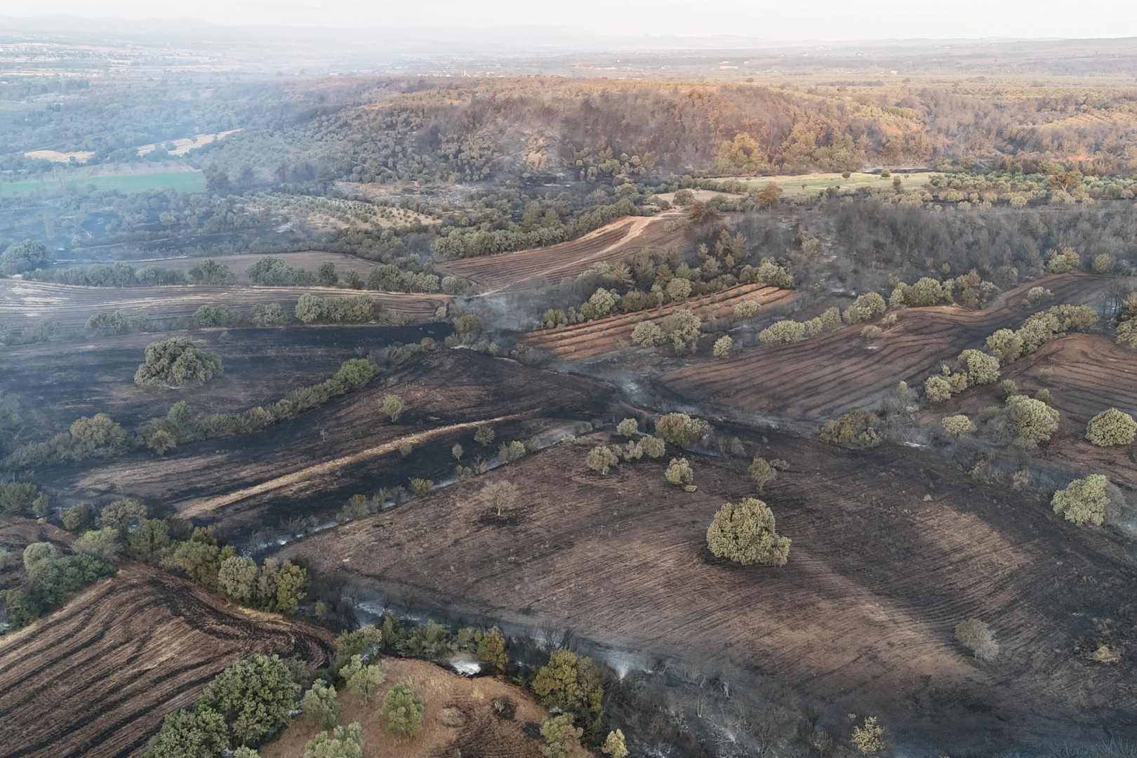 Çanakkale'nin Bayramiç ilçesinde çıkan orman yangınında, boşaltıldıktan sonra alevlere teslim olan Saçaklı köyünde dron ile görüntülendi.