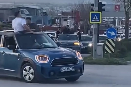Yaklaşık 7 aracın camlarından ve sunrooflarından çıkan vatandaşlar trafik kurallarını hiçe saydı.