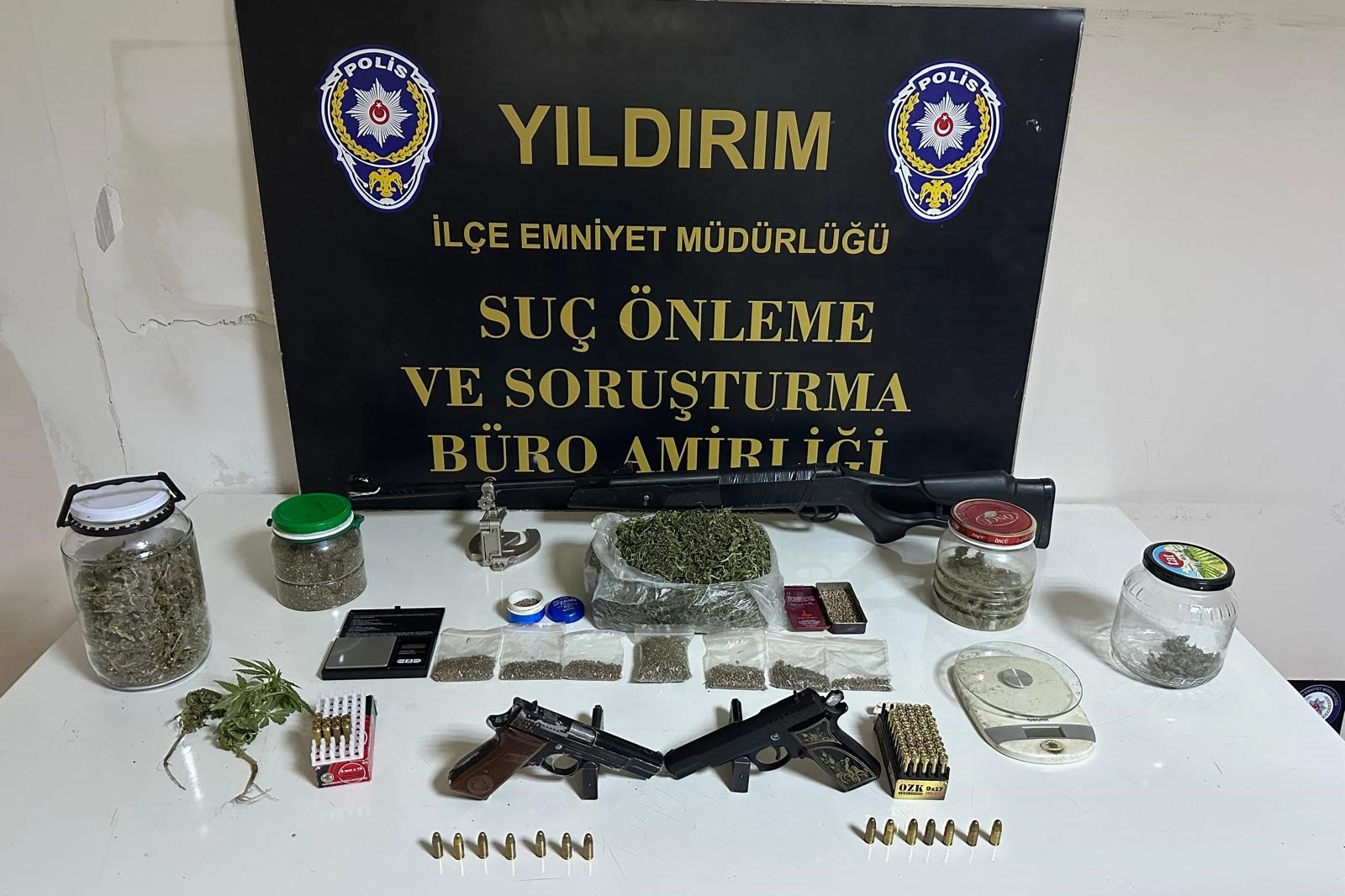 Yıldırım İlçe Emniyet Müdürlüğü Suç Önleme Ve Soruşturma (SÖS) Büro Amirliği ekipleri, uyuşturucu ticareti yapıldığı ve evde silah bulunduğu yönündeki ihbarlar üzerine harekete geçti. Şüphelilerin delilleri yok etmesini önlemek amacıyla ekipler, kapıyı dilenci kılığında çalarak dikkat çekmeden kapının açılmasını sağladı. Kapının açılmasıyla birlikte ekipler içeri girerek operasyonu başlattı. Evde yapılan aramalarda; 2 adet ruhsatsız tabanca, 67 adet fişek, 5 parça halinde toplam 728 gram esrar, 9 parça halinde 146 gram esrar tohumu, 2 kök hint keneviri, 86 adet şeffaf kilitli poşet, 1 adet havalı tüfek ve 2 adet hassas terazi ele geçirildi.