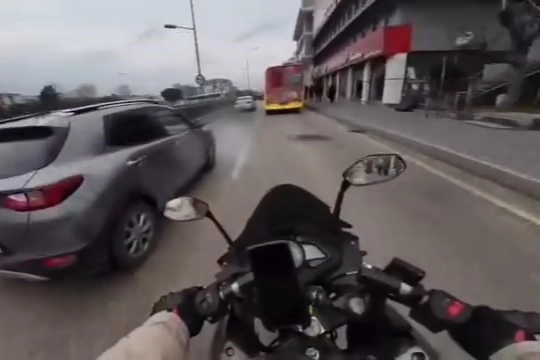 Olay, merkez Yıldırım ilçesi Ankara yolu üzerinde meydana geldi. Biranda hızlanan motosiklet sürücüsü, otobüse çarpmamak için solundan giden otomobilin önüne geçtiği an direksiyon hakimiyetini kaybetti. Sağa ve sola doğru yalpalayan motosiklet, sürücüsü kısa bir süre sonra direksiyonu toplamasıyla yoluna devam etti. Yaşanan korku dolu anlar, motosikletlinin kask kamerasına yansıdı.