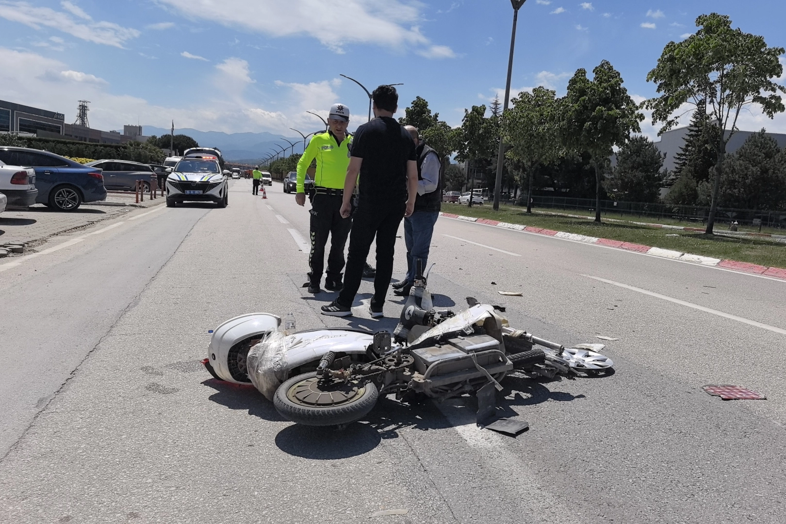 Kanlar içindeki yaralı, parçalanan elektrikli bisikletini toplamaya çalışırken, olay yerine gelen 112 Acil Servis ambulansında görevli sağlık ekiplerine de hastaneye gitmemek için direndi. Yaralı Erdal O. bisikletini bırakmazken, polis ve 112 ekipleri yaralıyı acil servise götürmek için dakikalarca dil döktüler. Yaralı, yaklaşık 15 dakika süren ikna sonucu ambulansla İnegöl Devlet Hastanesine kaldırıldı.