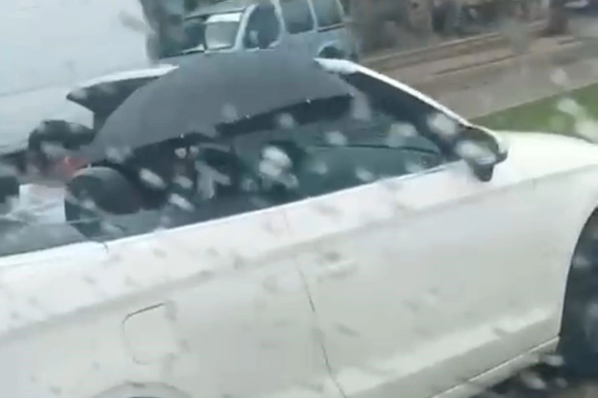 Bursa'nın merkez Nilüfer ilçesinde seyir halinde olan sürücü aracının açılır tavanını kapatamayınca yan koltukta oturan arkadaşı yağmurdan korunmak için farklı bir yönteme başvurdu. Şemsiye açarak seyahat eden sürücü ve arkadaşı, yoldan geçen diğer sürücüler ve yayalar tarafından şaşkınlıkla izlendi. Bazı vatandaşlar, sürücünün bu cesur ve eğlenceli hareketine gülerek tepki verirken, kimisi de o anları cep telefonu kamerasıyla kayda aldı.
