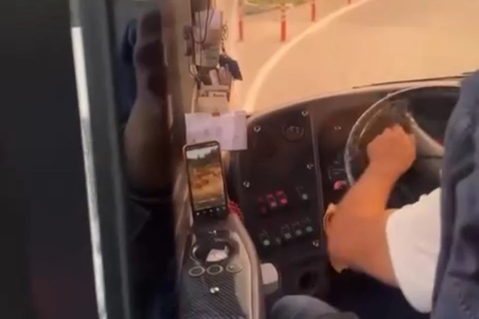 Yürekleri ağza getiren şoförün rahat hareketleri dikkat çekerken, yolcuların uyarılarına rağmen şoför videoyu izlemeye devam etti ve bu durum otobüste gergin anlar yaşanmasına neden oldu.