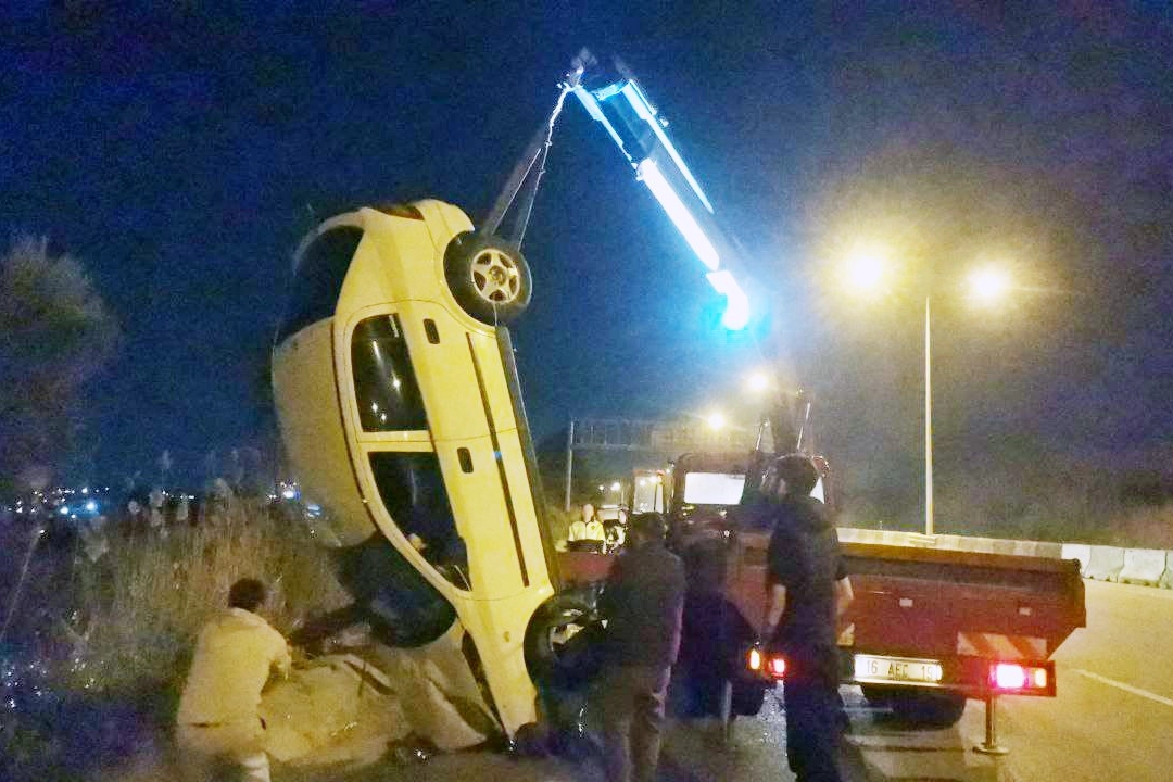 Kasa, gece saat 00.00 sıralarında Mudanya ilçesi Aydınpınar mevkiinde meydana geldi. Edinilen bilgiye göre, 16 RL 525 plakalı araç, sürücüsünün direksiyon hakimiyetini kaybetmesi sonucu kontrolden çıkarak taklalar attı. Refüjden aşağı zeytinlik alandaki ağaçlara takılan otomobili görenler, 112 Acil Servis ekiplerine bilgi verdi. Olay yerine sağlık ve polis ekipleri geldi. Yaralı, ilk müdahalesinin ardından Mudanya Devlet Hastanesi'ne kaldırıldı.