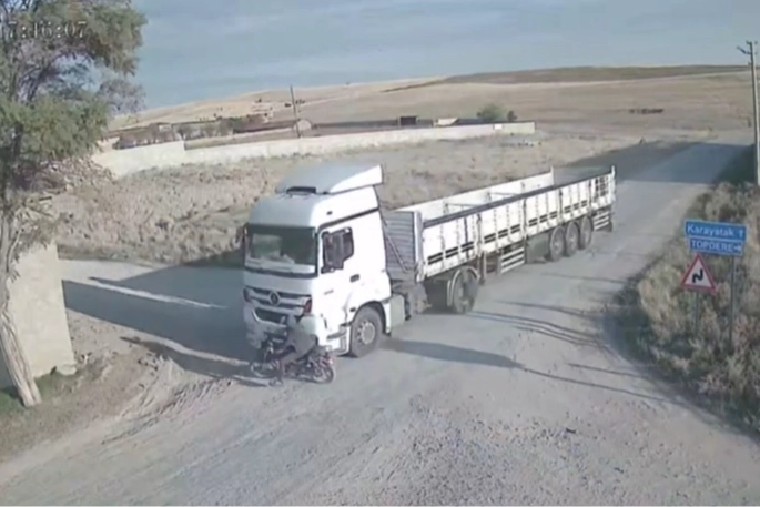 Öte yandan, yaşanan kazı anı ise çevredeki bir güvenlik kamerasına yansıdı. Görüntülerde tırın motosiklete çarptıktan sonra sürüklediği görülüyor.