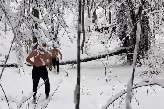 Bursa'da kar yağışı etkili oldu. Uludağ'ın eteklerinin kar tutması sebebiyle ormanlık alanda iki kafadar eğlenceyi zirveye taşıdı. Hava sıcaklığının eksi dereceleri gördüğü Kaplıkaya'da iki arkadaş, yarı çıplak bir şekilde karın tadını çıkardı. İki kafadar yarı çıplak şekilde kara gömülürken, koşarak da spor yaptı.