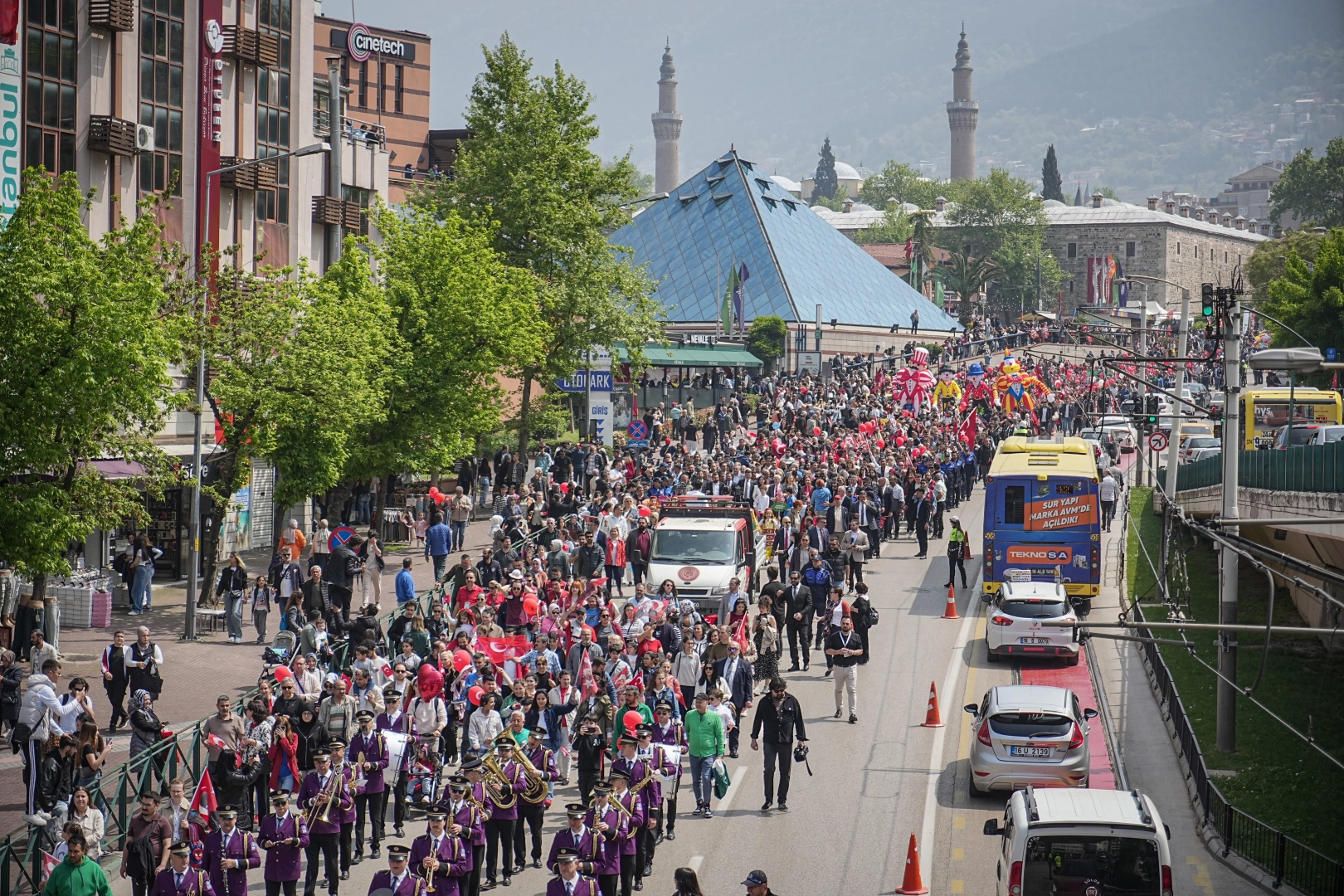 23 Nisan Ulusal Egemenlik ve Çocuk Bayramı tüm Türkiye'de olduğu gibi Bursa'da da büyük bir coşkuyla kutlandı. Bursa Büyükşehir Belediyesi tarafından 'Onların Gülüşü Hepimizin Yarını' teması ile hazırlanan '23 Nisan Çocuk Şenliği'nde çocuklar, dolu dolu program içeriğiyle unutulmaz bir gün geçirdi. 23 Nisan coşkusu, yüzlerce çocuk ve ailelerinin katılımıyla Altıparmak Caddesi'nden Merinos Parkı'na doğru yapılan kortej yürüyüşüyle başladı. Ellerindeki Türk bayraklarıyla marşlar söyleyerek ve şiirler okuyarak yürüyen çocuklara, Büyükşehir Belediye Başkanı Mustafa Bozbey ve eşi Seden Bozbey ve CHP İl Başkanı Nihat Yeşiltaş da eşlik etti.