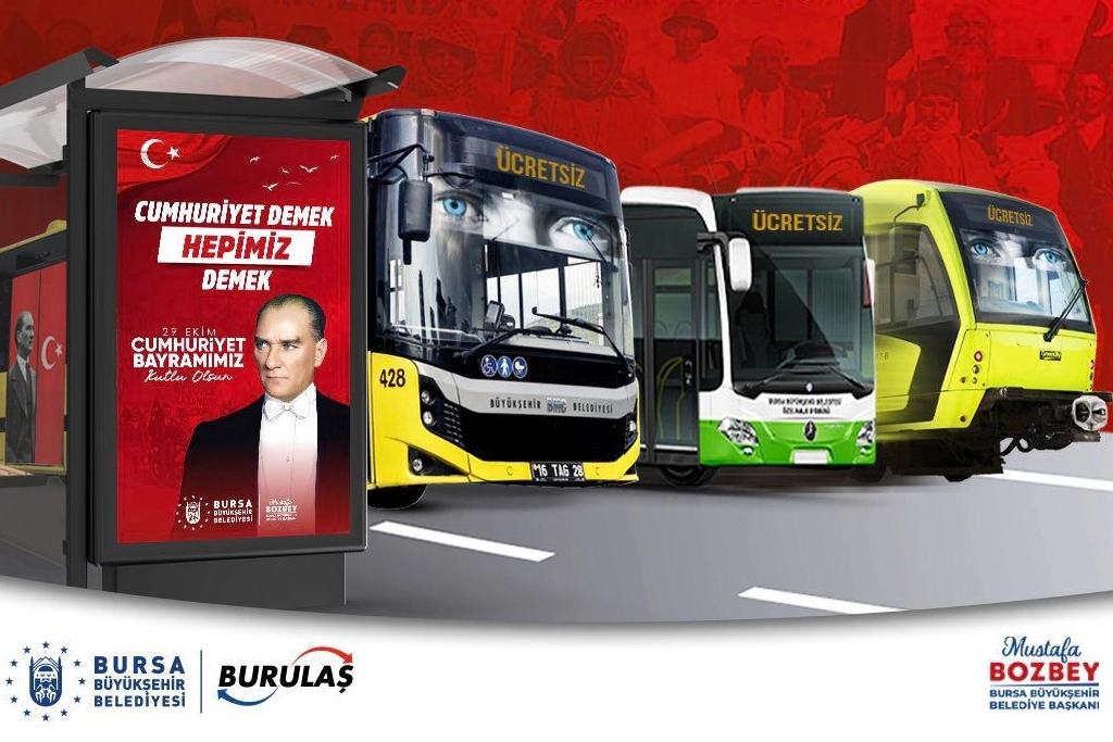 Bursa Büyükşehir Belediyesi tarafından yapılan açıklamada şu cümlelere yer verildi; "Kent içinde ayakta yolcu taşıyan BursaRay, tramvay ve otobüs hatlarımız, 29 Ekim 2025 Çarşamba günü saat 23.59’a kadar, BursaKart kullanmak suretiyle ücretsiz olarak hizmet verecektir. Bayramımızı hep birlikte coşkuyla, onurla ve gururla kutlayalım."