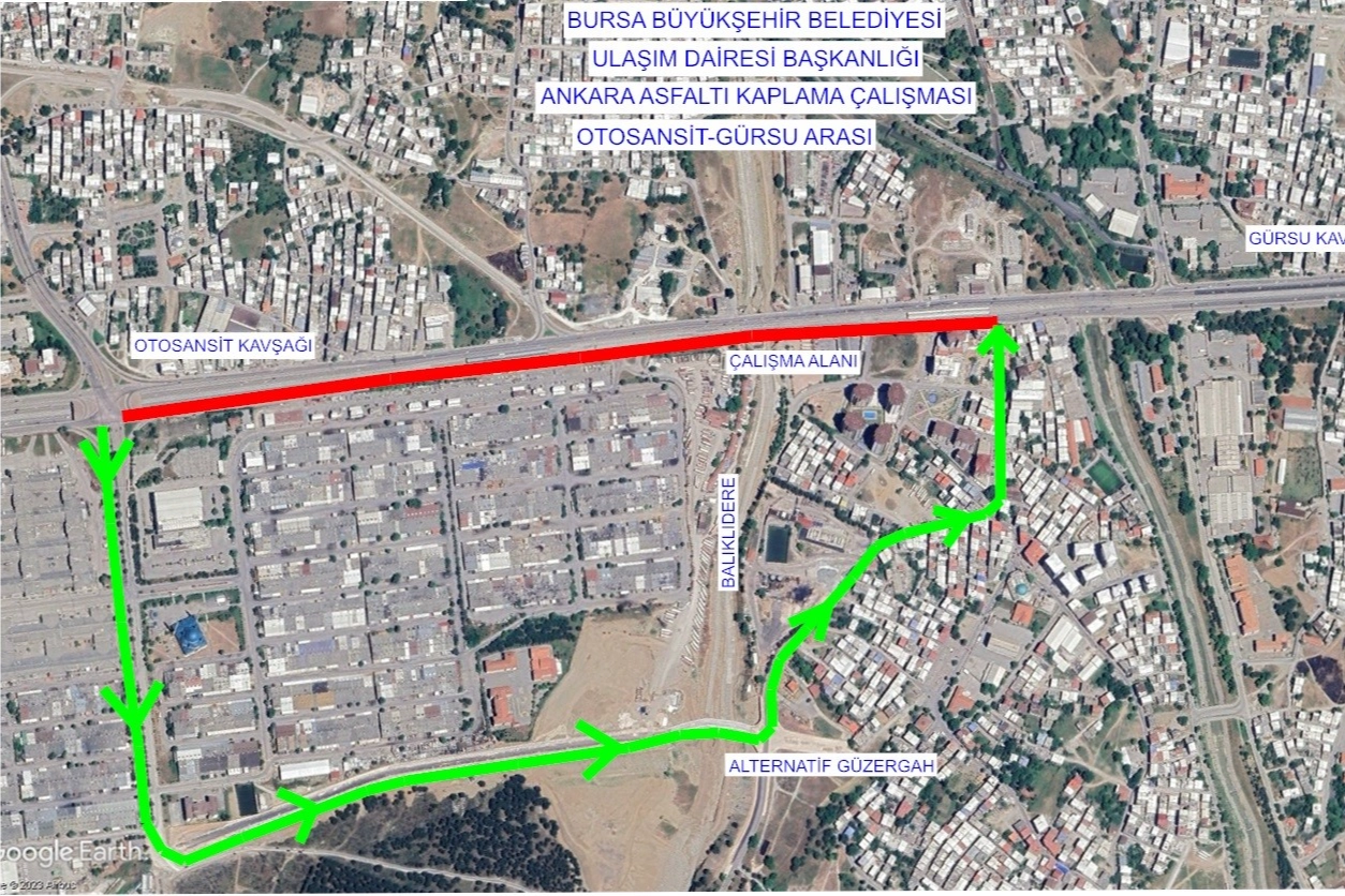 Bursa Büyükşehir Belediyesi tarafından yapılacak asfalt yenileme çalışmaları çerçevesinde Bursa-Ankara yolu Ankara gidiş istikameti Otosansit Kavşağı ile Gürsu Kavşağı arası 04 Ağustos Cuma (BUGÜN) günü saat 23.00’dan 05 Ağustos Cumartesi (YARIN) günü saat 06.00’ya ve 05 Ağustos Cumartesi (YARIN) günü saat 23.59’dan 06 Ağustos Pazar günü saat 11.00’a kadar trafiğe kapatılacaktır.
