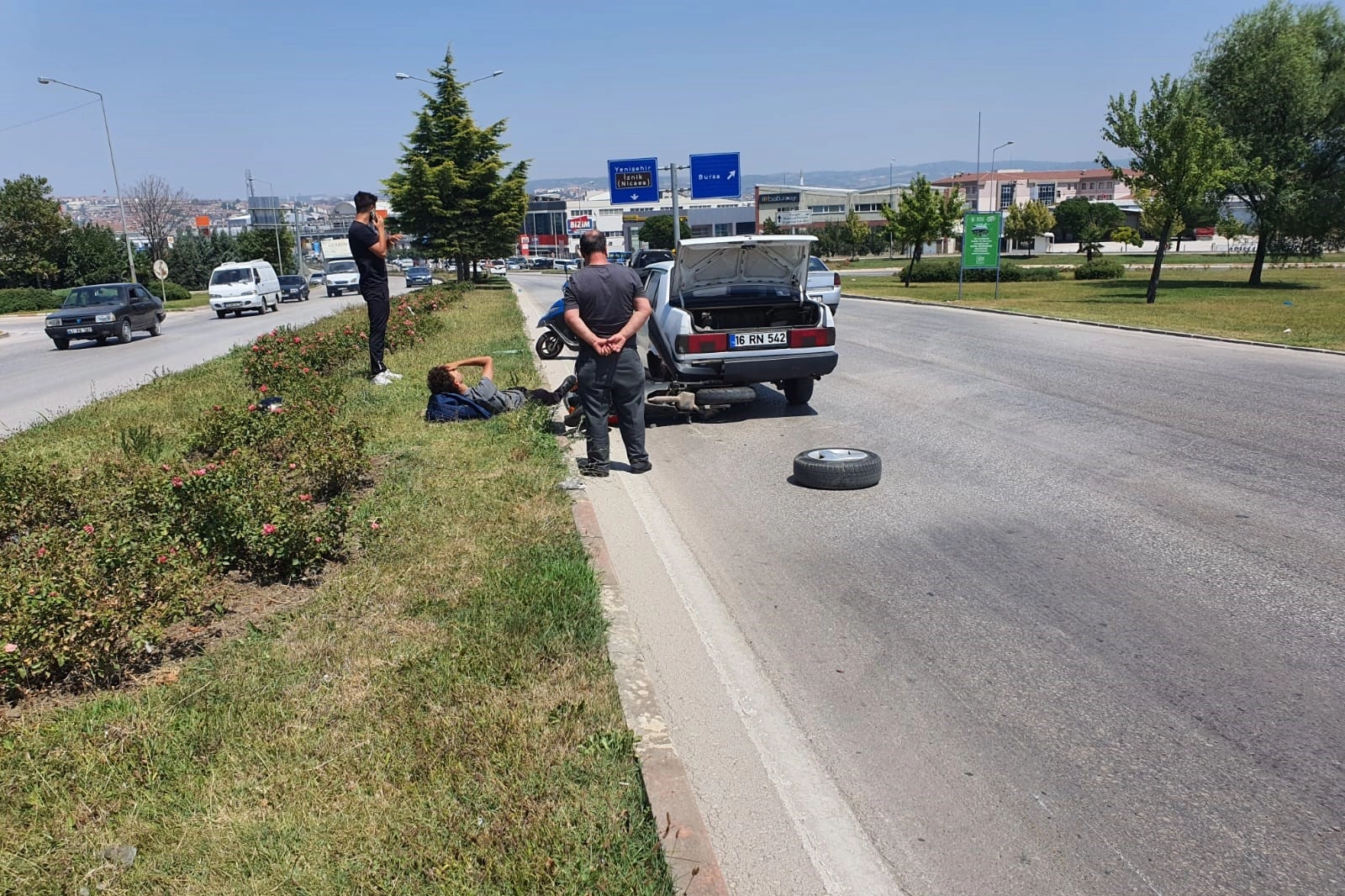Bursa-Ankara karayolu Alanyurt istikametine seyir halinde olan Süleyman G. yönetimindeki 16 RN 542 plakalı otomobil kavşak üzerinde arıza yaptı. Sürücü, aracını sol şeritte durdurarak tamirci beklemeye başladı. Bu sırada aynı istikamette seyir halinde olan Enes B. yönetimindeki 16 SGA 33 plakalı motosiklet, otomobile arkadan çarptı. Kaza sonucu motosiklet otomobilin altına girerken, sürücü ise yere düşerek yaralandı. Sürücüye ilk müdahaleyi çevredeki vatandaşlar yaptı. Refüjdeki çimenlik alana sırt üstü yatırılan yaralı genç, olay yerine gelen ambulansla İnegöl Devlet Hastanesi Acil Servisine kaldırılarak tedavi altına alındı.
