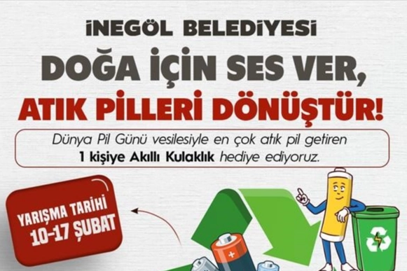 Belirli gün ve haftalar çerçevesinde düzenlediği kampanya ve etkinliklerle dikkat çeken İnegöl Belediyesi, 18 Şubat Dünya Pil Günü için yeni bir yarışmanın startını verdi. Daha önce elektronik atık, atık kitap, atık yağ toplama gibi yarışmalar yapan İnegöl Belediyesi, Dünya Pil Günü'nde pil atıklarının çöpe gitmemesi için Atık Pil Toplama Kampanyası düzenlendiğini açıkladı. Kampanya kapsamında vatandaşlar, 17 Şubat tarihlerine kadar atık pilleri İnegöl Belediyesi’nin 3 ayrı noktada bulunan Sıfır Atık Noktalarına getirecek. Merkezde Fatih Cami karşısında bulunan alanda yer alan Sıfır Atık Noktası Pazartesi ve Perşembe günleri açık olacak. Alanyurt bölgesinde Salı Pazarı bölgesinde kurulan Sıfır Atık Noktası Salı ve Cumartesi günleri, Yeniceköy Mahallesi'nde Belediye Ek Hizmet Binası önünde bulunan Sıfır Atık Noktası ise Çarşamba ve Cuma günleri açık olacak. Sıfır Atık Noktaları kendi günlerinde 09.00 ile 16.00 saatleri arasında atıkları kabul edecek. Bu noktalara atık pilleri getirerek yarışmaya katılacaklar arasında en fazla atık pil getiren kişi ise akıllı kulaklık kazanacak.