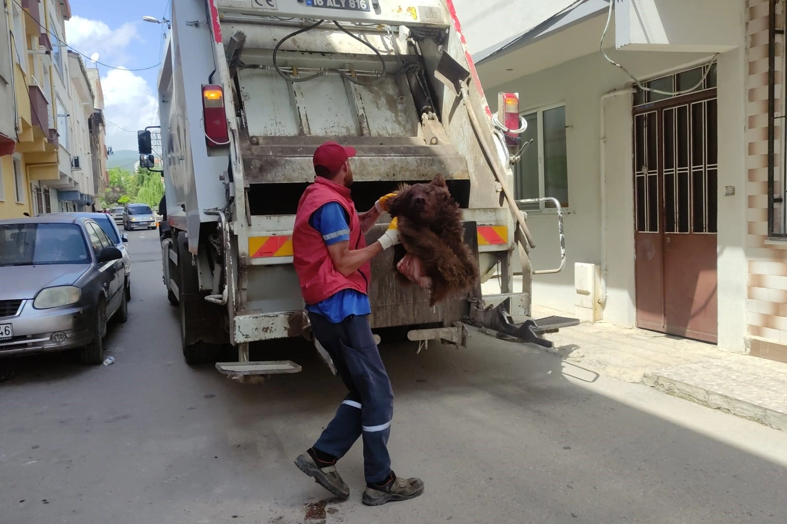 Çöp konteynerlerinin içinde et parçası gören temizlik görevlileri durumu polis ekiplerine bildirdi. Olay yerine gelen polis ekipleri et parçalarının ayıya ait olduğunu belirledi.