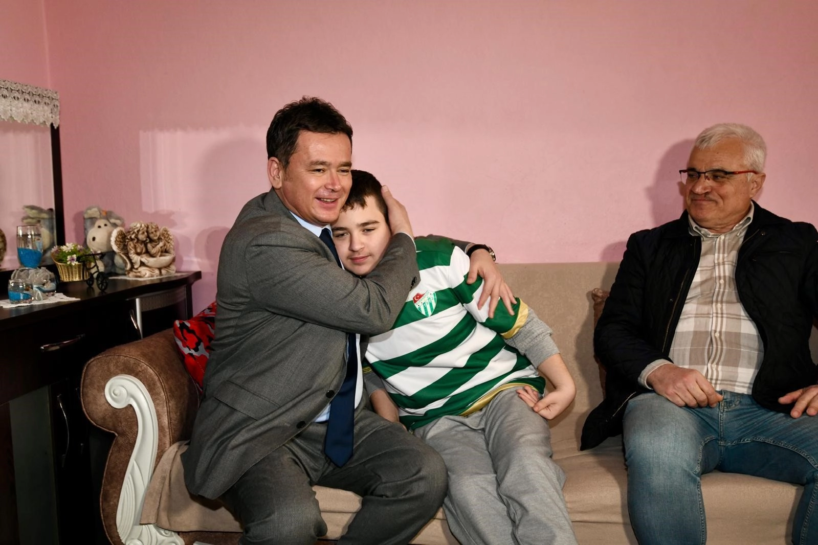 Sevgi ve samimiyetin hakim olduğu buluşmada Yunus Emre ile yakından ilgilenen Başkan Aydın, özel gereksinimli bireylerin her zaman desteklenmesi gerektiğini vurguladı. Doğum günü pastasının kesilmesiyle birlikte evde neşe dolu anlar yaşanırken, Başkan Erkan Aydın’ın içten yaklaşımı ziyarete ayrı bir anlam kattı. Bu tür buluşmaların toplumsal dayanışmayı ve gönül bağlarını güçlendirdiğini belirten Başkan Erkan Aydın, "Yunus Emre’nin bugün 15’inci doğum gününü kutladık. Kendisine bundan sonraki hayatında sağlıkla, huzurla; ailesiyle ve sevdikleriyle birlikte nice güzel yaşlar diliyoruz. Bu buluşma bizim için gerçekten çok anlamlıydı" ifadelerini kullandı. Hazırlanan sürpriz ile oldukça mutlu olduğunu söyleyen Yunus Emre Erdem ise kendisini kırmadığı için Osmangazi Belediye Başkanı Erkan Aydın’a teşekkürlerini sundu.