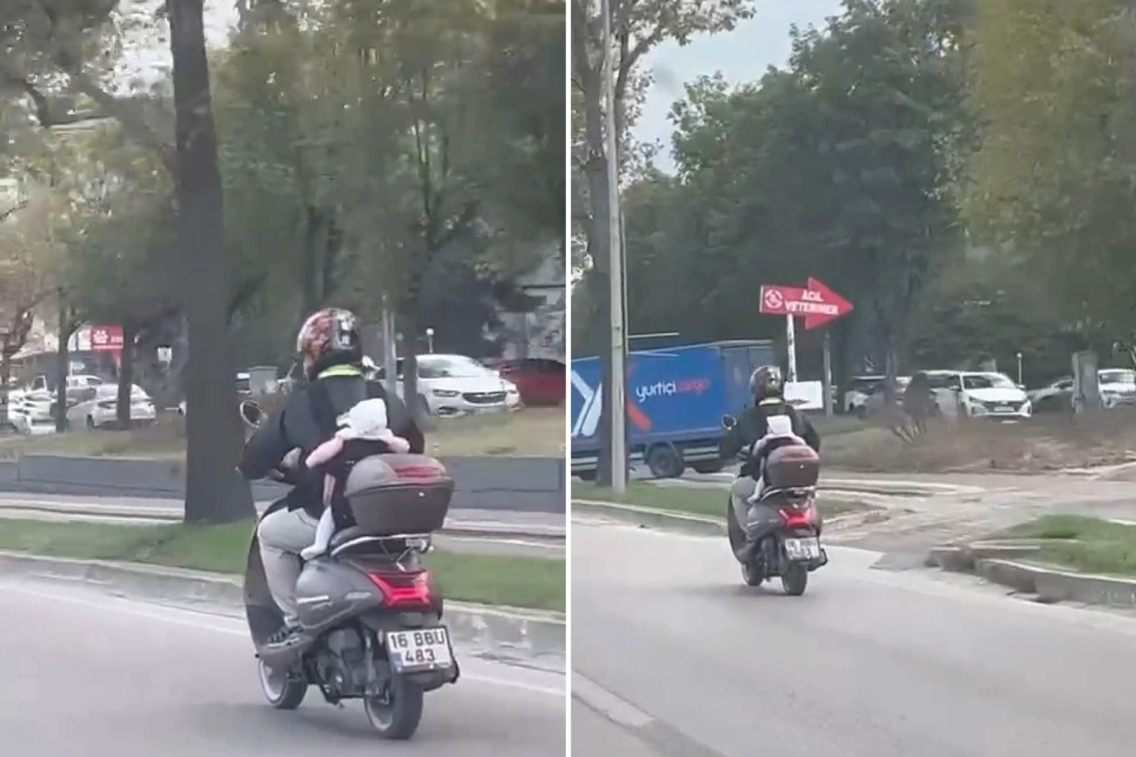 Merkez Osmangazi ilçesi Ankara Yolu Caddesi’nde seyir halinde olan motosikleti görenler şaşırdı. Motosiklet sürücüsü baba, bebeğini arkasına bağlayarak kilometrelerce ilerledi. Yürekler ağıza getiren anlara şahit olan diğer sürücüler o anları saniye saniye cep telefonu kameraları ile kaydetti.
