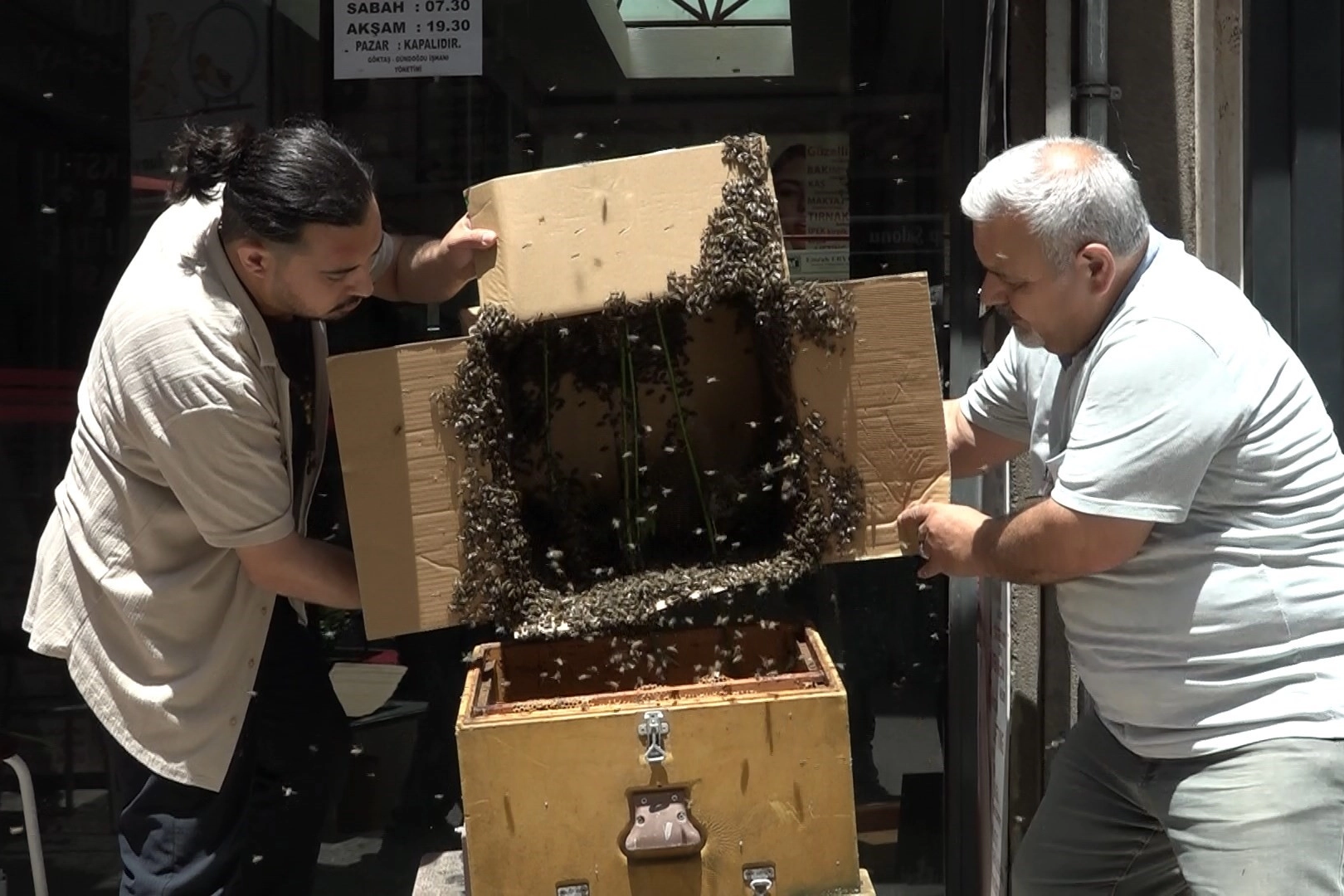 Bursa'da şehir merkezindeki bir iş hanını basan arılar, çalışanları esir aldı. Öğle saatlerinde biranda iş merkezinin girişindeki kepenge toplanan arılar, esnafa da vatandaşa da korku dolu anlar yaşattı. Kimi umursamadan iş merkezine girerken, kimisi ise yolunu değiştirdi. Esnafın bilgi vermesi üzerine olay yerine gelen arıcılıkla uğraşan ekipler, ilk önce kutunun içine aldığı arıları sonrasında ise peteklerin bulunduğu sandığa aldı. Arıları büyük bir soğuk kanlılıkla alan kişiler, esnafa ve vatandaşa da rahat nefes aldırdı. Muhtemelen çevrede bulunan bir koloniden arıların gelebileceğini belirten Hüseyin Savcı, "Uludağ'ın eteklerinden de gelebilir. Haber verdikleri gibi buraya geldik. Zararsız arılar bunlar. Koloniyi ilk önce kutuya indirdik. Bal arısı bunlar" diye konuştu. Ehet Taştan ise, "Vatandaşlara zarar vermemesi için kısa sürede buraya geldik. Buraya yuva yapmasının sebebi, oğulun içeride kraliçe vermesinden kaynaklı. 2 tane olan kraliçe kavga ettiği zaman biri kovandan ayrılıyor. Ayrılanda buraya gelmiş. En yakın bölge olarak burayı görmüş. Kimse arı gördüğü zaman arılara el sallamasın. Çünkü onlar el salladığınız zaman size saldırır" dedi.