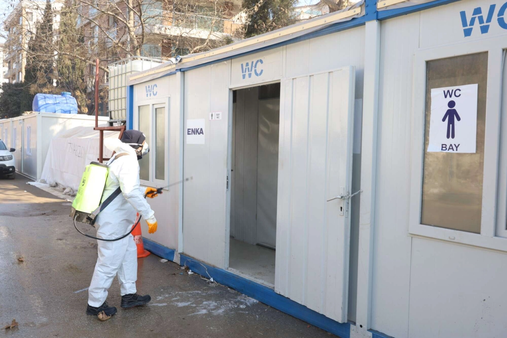 Hatay’da ‘seyyar tuvaletler kurulması, çadır ve konteyner kentler oluşturulması ve gelen yardımların koordineli bir şekilde dağıtılması görevlerini’ üstlenen Bursa Büyükşehir Belediyesi, ilaçlama işlemlerine de ilk günden itibaren devam ediyor. Antakya ilçesindeki sabit ve seyyar tuvaletler ile ‘Büyükşehir Belediyesi tarafından kurulan’ konteyner kentlerde dezenfeksiyon işlemlerini sürdüren Bursa Büyükşehir Belediyesi Veterinerlik Şubesi Müdürlüğü ekipleri, salgın hastalıkların önüne geçebilmek adına çalışmalarını yoğun bir şekilde devam ettiriyor. Düzenli olarak fare ilaçlaması da yapan ekipler, havaların ısınmasıyla birlikte haşere ilaçlamasına da start verecek. Her gün BUSKİ’nin temizlediği konteyner tuvaletlerde düzenli dezenfeksiyon çalışması yapan ekipler, Büyükşehir Belediyesi’nin Hatay’daki Koordinasyon Merkezi’ndeki yemek yeme ve kalınan alanlarda da ilaçlama faaliyetlerini sürdürüyor. İlerde oluşabilecek karasinek tehdidine karşı Bursa’da ekipler hazır tutulurken, ihtiyaç halinde bölgeye sevk gerçekleşecek. İlaçlama çalışmalarının düzenli olarak devam edeceği belirtildi.