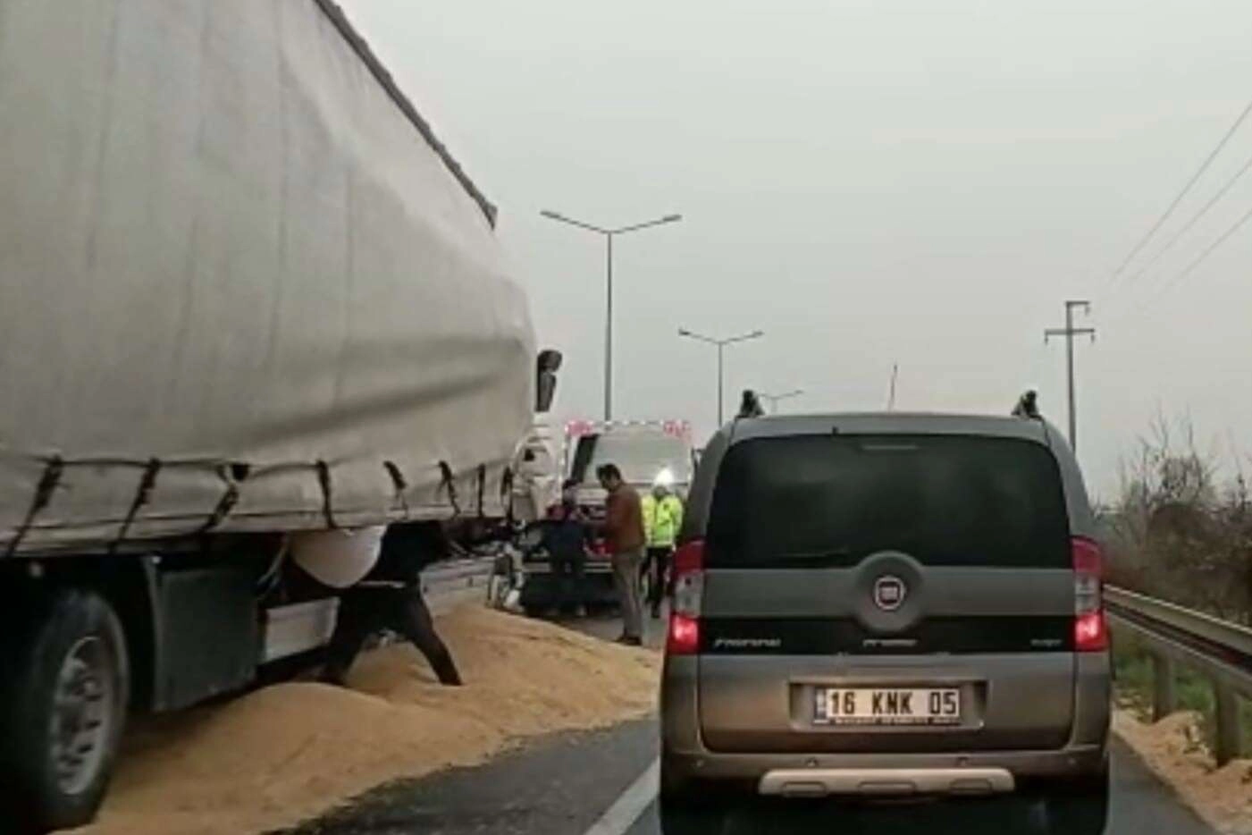Kaza sabah 07.00 sıralarında Bursa-Ankara karayolu üzeri İnegöl girişinde meydana geldi. Bozüyük istikametinden İnegöl'e seyir halinde olan sürücü Turgut Kaya(41) yönetimindeki 16 ABA 220 plakalı tır, önünde seyir halinde olan sürücü Tahir Sara(34) yönetimindeki 63 ADS 25 plakalı tıra arkadan çarptı. Kaza sonucu sürücü Turgut Kaya Yaralandı. Yaralı olay yerine sevk edilen Ambulansla İnegöl Devlet Hastanesine kaldırıldı. Hurdaya dönen hububat yüklü tır, çekici yardımıyla yoldan kaldırıldı.