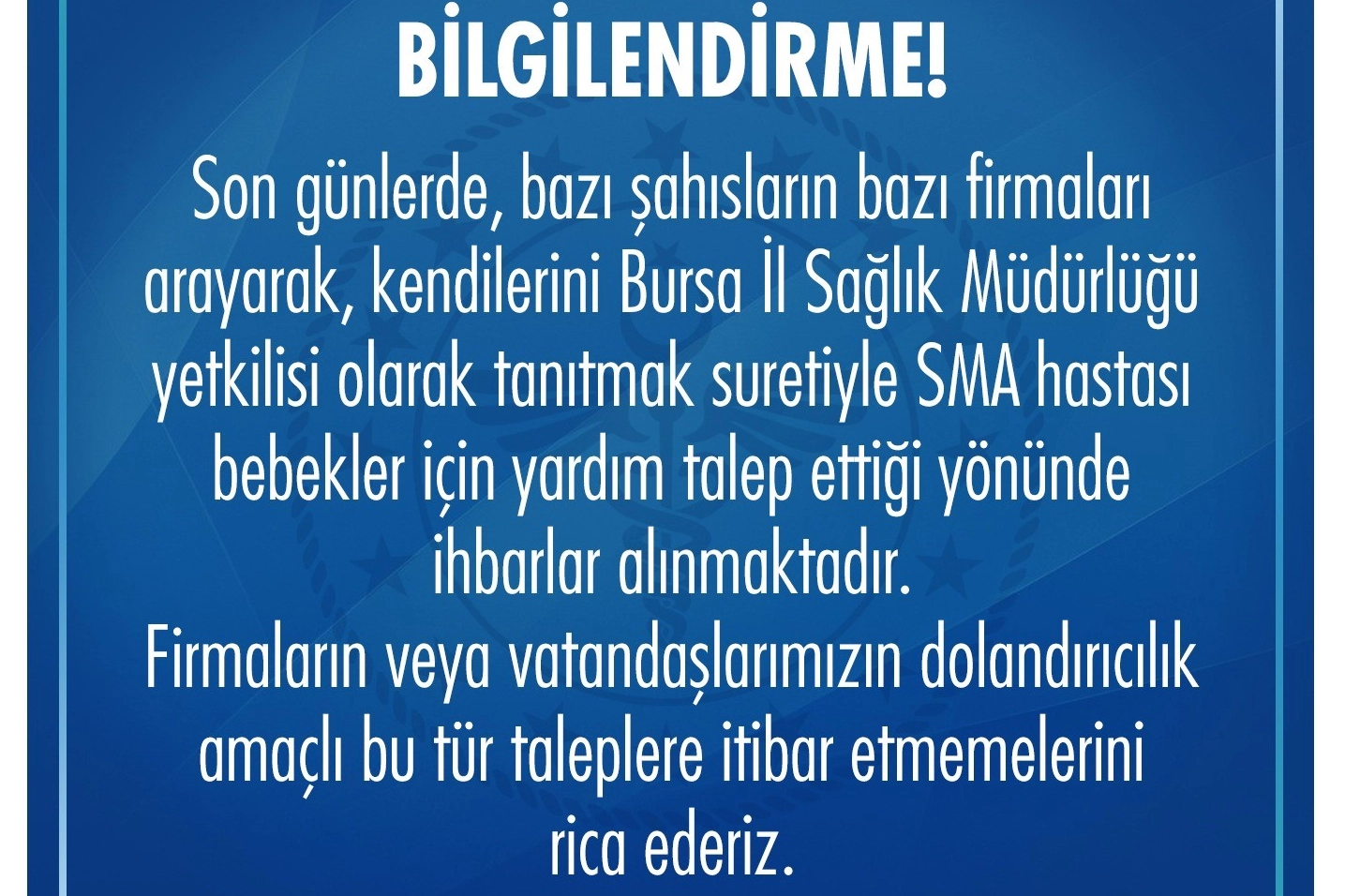 Bursa İl Sağlık Müdürlüğü'nün sosyal medya hesabından yaptığı açıklamada şu ifadelere yer verildi: "Son günlerde, bazı şahısların bazı firmaları arayarak, kendilerini Bursa İl Sağlık Müdürlüğü yetkilisi olarak tanıtmak suretiyle SMA hastası bebekler için yardım talep ettiği yönünde ihbarlar alınmaktadır. Firmaların veya vatandaşlarımızın dolandırıcılık amaçlı bu tür taleplere itibar etmemelerini rica ederiz".