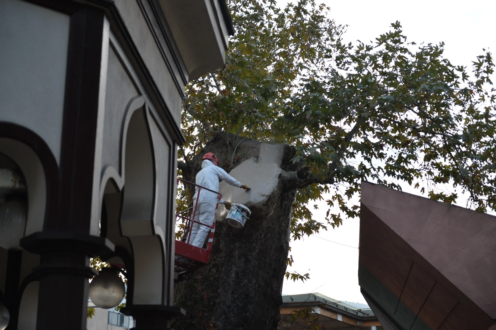 Park ve Bahçeler Dairesi Başkanlığı ekipleri tarafından yapılan incelemede, anıt ağacın açık yarasında çürümüş ve mantarlaşmış bölümler tespit edildi. Hızlı bir şekilde bakım ve restorasyon işlemlerine başlayan ekipler, özel ilaçlarla ‘çürümeye yol açan’ bakterileri temizledi. Ağacın iskeletine teller aracılığıyla destek uygulanırken, son aşamada özel yalıtım malzemesi kullanılarak ağacın açık yarası kapatıldı. Tedavi gören kısım boyanarak çınar ağacının formu yeniden düzenlendi.