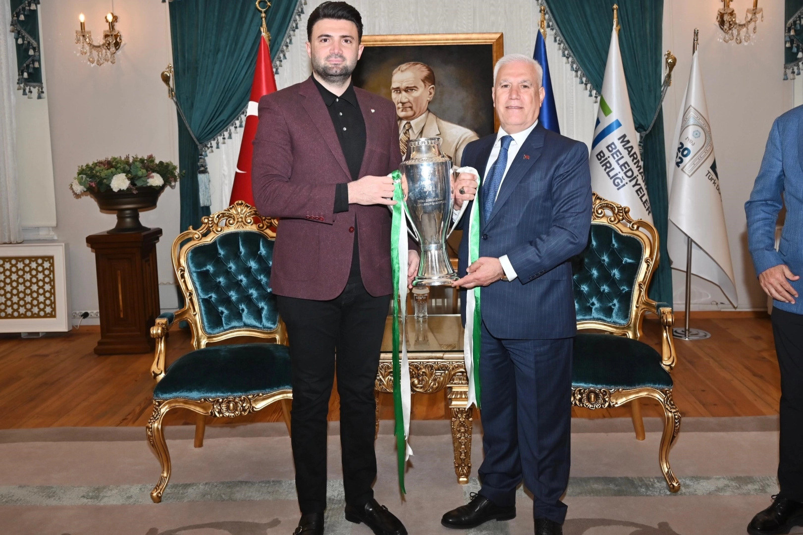 Nesine 3. Lig 1. Grup'ta şampiyonluğa ulaşarak 2. Lig'e yükselmeye hak kazanan Bursaspor’un Başkanı Enes Çelik ve yönetim kurulu üyeleri, şampiyonluk kupasıyla birlikte Bursa Büyükşehir Belediye Başkanı Mustafa Bozbey’i Tarihi Belediye Binası’nda ziyaret eti. Samimi bir ortamda gerçekleşen ziyarette, zorlu bir süreçten geçerek bir üst lige çıkmayı başaran Bursaspor’un yeni hedefleri konuşuldu.