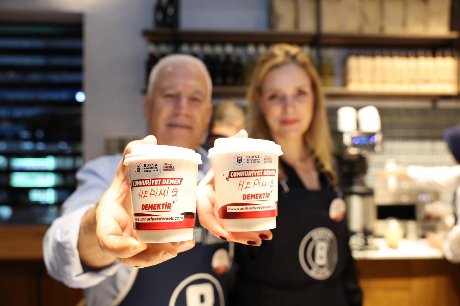 "Cumhuriyet demek, hepimiz demek" Eşi Seden Bozbey ile birlikte barista önlüklerini giyen Başkan Bozbey, Cumhuriyetin 102. yılına özel olarak hazırlanan ‘Cumhuriyet Demek’ temalı bardaklarda içecek ikramında bulundu. Vatandaşların isimlerini ‘Cumhuriyet demek' temalı bardaklara yazan Başkan Mustafa Bozbey ve eşi Seden Bozbey, Atatürk’ün emanet ettiği Cumhuriyet’in sıcaklığını Bursalılarla birlikte paylaştı. Bu sene kutlamaların teması olan ‘Cumhuriyet demek, hepimiz demek’ sloganını da yazarak ikramda bulunan Başkan Bozbey ve eşi Seden Bozbey, kahve keyfini vatandaşlarla birlikte yaşadı.