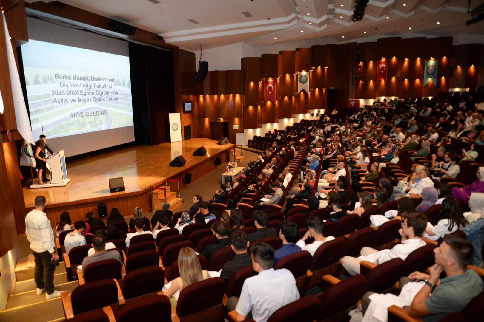 Bu yıl 4. kez akademik takvimi başlatan BUÜ Diş Hekimliği Fakültesi, yeni öğrencileri için açılış ve beyaz önlük giyme töreni düzenledi. Prof. Dr. Mete Cengiz Kültür Merkezi’nde organize edilen törene Rektör Prof. Dr. Ferudun Yılmaz, Rektör Yardımcısı Prof. Dr. İrfan Kırıştıoğlu, Diş Hekimliği Fakültesi Dekanı Prof. Dr. Alper Pampu, farklı fakültelerin dekanları, sivil toplum kuruluşlarının temsilcileri, akademisyenler, hayırseverler, öğrenciler ve aileleri katıldı. Genç ve dinamik fakülte Açılış programında konuşan Rektör Prof. Dr. Ferudun Yılmaz, genç ve dinamik bir fakülte oluşturduklarını söyledi. Bursa Uludağ Üniversitesi’nin Araştırma Üniversitesi vizyonu ile çalıştığına işaret eden Prof. Dr. Ferudun Yılmaz; “Türkiye’deki 23 Araştırma Üniversitesi arasında yer alıyoruz. Üstlendiğimiz bu misyonun geliştirilmesi için de en genç ve en dinamik fakültelerimiz arasında bulunan Diş Hekimliği Fakültemize çok güveniyoruz. Üniversitemizi tercih eden yeni öğrencilerimiz, böylesine özel bir ortama gelmiş bulunuyor. Deneyimli bir akademik kadromuz var. Bu kadroyu daha da güçlendireceğiz. Fakültemizin inşaatı hayırseverlerin desteğiyle devam ediyor. Kısa süre içinde inşaatımızı bitireceğiz. Öğrencilerimize de burada hem pratik hem de teorik eğitim vermeye başlayacağız” açıklamasında bulundu.