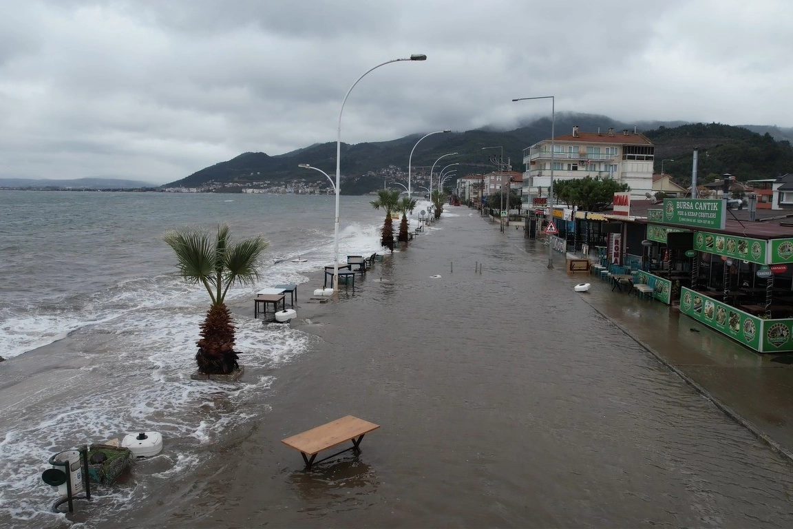 Bursa'nın Gemlik ilçesine bağlı Kurşunlu Mahallesi'nde Marmara Denizi'nde etkili olan kuvvetli fırtına ve yoğun gelgit nedeniyle deniz seviyesi yükseldi. Kıyıya vuran dev dalgalar sahil şeridini aşarak yolu kapladı, bazı bölgelerde su seviyesi kaldırım ve iş yerlerinin önüne kadar ulaştı. Deniz taşkını nedeniyle sahil yolu ulaşıma kapanırken, mahalle sakinleri zor anlar yaşadı. Araçların ilerlemekte güçlük çektiği bölgede vatandaşlar güvenli alanlara çekildi. İhbar üzerine bölgeye AFAD ve belediye ekipleri sevk edildi. Ekipler, taşkın yaşanan noktalarda güvenlik önlemleri alırken su tahliye ve temizlik çalışmalarına başladı. Fırtınanın etkisiyle oluşan deniz taşkını ve dalgaların yola kadar ulaştığı anlar ise dron ile havadan görüntülendi. Görüntülerde sahil yolunun büyük bölümünün suyla kaplandığı ve dalgaların kıyı hattını aştığı görüldü. Yetkililer, olumsuz hava şartları devam ettiği sürece vatandaşların sahil kesimlerinden uzak durmaları yönünde uyarılarda bulundu. Bölgede ekiplerin çalışmaları sürüyor.
