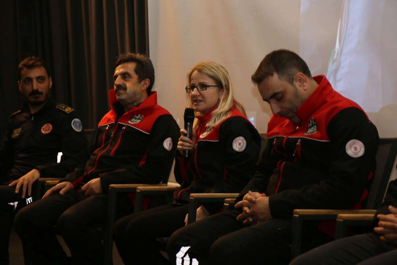 Gürsu Belediyesi Kültür Merkezi’nde gerçekleştirilen eğitime; GÜRAK, UMKE, Bursa itfaiyesi, öğretmenler ve ekiplerin aileleri ile afetlerde gönüllü olmak isteyen Gürsulular ve Gürsu protokolü katıldı. Afetler konusunda farkındalığın hayat kurtardığını vurgulayan Gürsu Belediye Başkanı Mustafa Işık, “Yaşadığımız felaketten hepimizin üzerine düşen dersleri alarak, muhtemel afetlerde can kaybını önlemeye yönelik alınması gereken tedbirleri her an günncellememiz olmazsa olmazdır. Afetlerin en az hasarla ve can kaybı olmadan atlatılabilmesinin en önemli bileşenlerini hep birlikte ortaya koyacağımız sorumluluklarla sağlayabiliriz. Bu düşüncede, bireyler olarak da her birimizin üstlenmesi gereken sorumluluklar var. Hayatımızı kurtaracak bu sorumlulukları, depremin etkilerini yaşayarak gören ekiplerimizin yönlendirmesiyle ait hissedelim istedik. Bu gayeyle, ekiplerimizin bölgede ortaya koyduğu özverili çabalarıyla edindikleri tecrübeleri aktararak, hepimiz için farkındalık oluşturmalarını ve gönüllü olmak isteyen hemşehrilerimiz için yol göstermelerini sağlamak amacıyla bu söyleşiyi düzenledik. Onların gözünden deprem gerçeğini dinledik. Tüm ekibimize özverili çalışmaları ve bizlere kazandırdıkları şuur için teşekkür ediyorum” dedi.