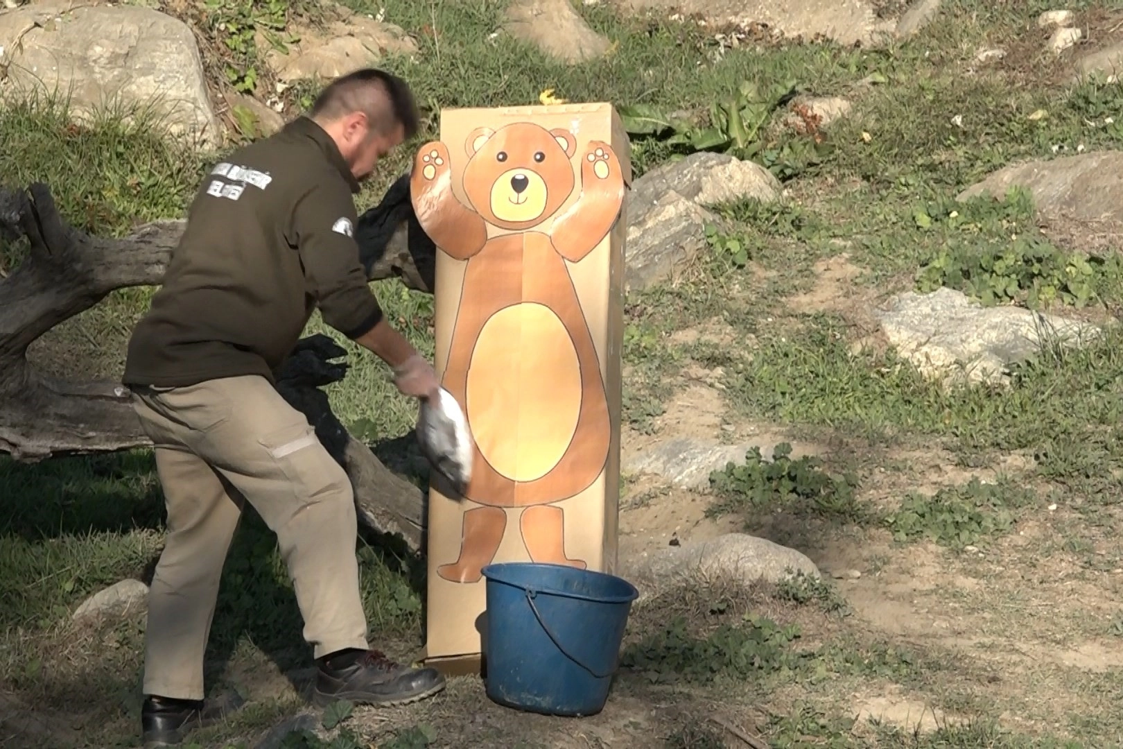 Bulundukları yerden alana gelen ayılar, ilk önce makete anlam veremedi. Temkinli yaklaşan ayılar, balığın kokusuna yaklaştıkça hızlarını arttırdı. Karton kutudan yapılan ayı maketini bir hamlede yerle bir eden ayılar, içine gizlenmiş balık, sebze ve meyveleri ise afiyetle midelerine indirdi.