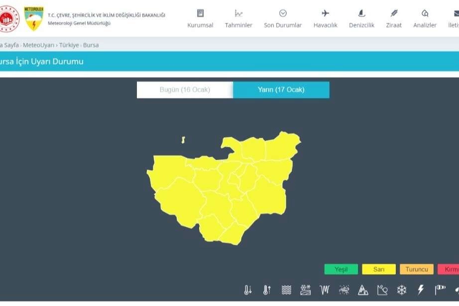 Meteoroloji Genel Müdürlüğü, Bursa için sarı uyarıda bulundu.