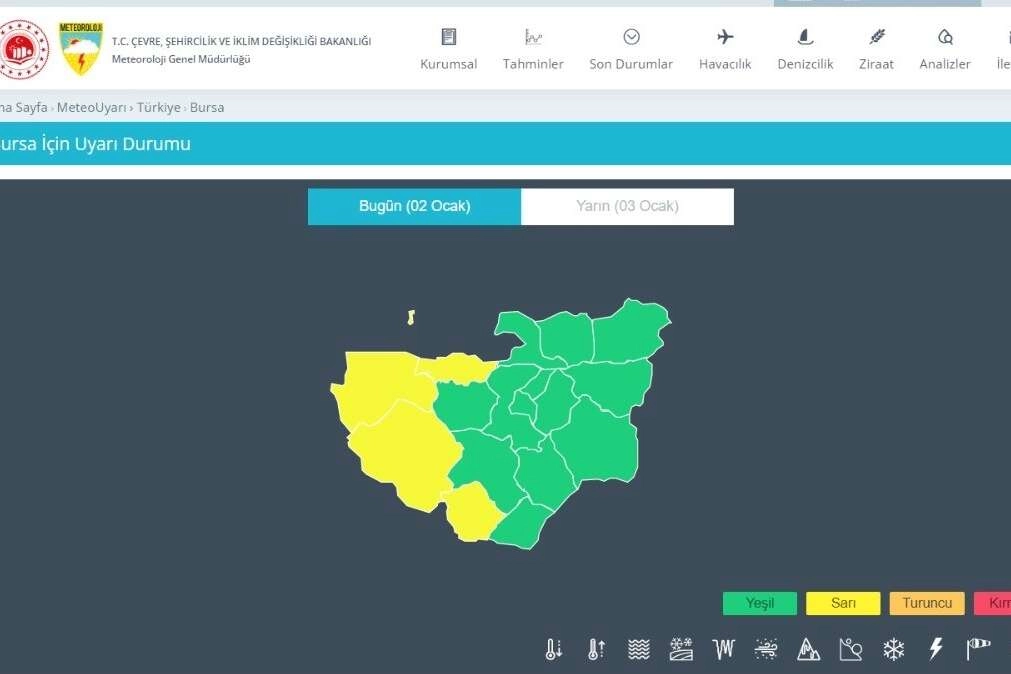 Uyarıda; Mustafakemalpaşa, Büyük Orhan, Mudanya ve Karacabey ilçelerinde bugün 18.00'dan başlayıp Perşembe günü saat 11.00'a kadar süreceği tahmin edilen “Gece ve sabah saatlerinde yoğun olmak üzere yer yer sis beklendiğinden görüş mesafesinde azalma, ulaşımda aksamalar gibi olumsuzluklara karşı dikkatli ve tedbirli olunmalıdır” ifadelerine yer verdi.