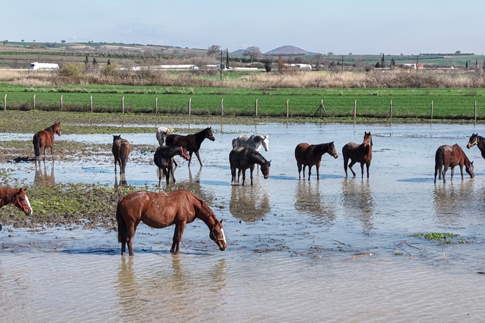 Uluabat Gölü, Bursa-İzmir kara yolunun kıyısına kadar gelirken bölgede bulunan milyonluk yarış atlarının bulunduğu tarlalar da su altında kaldı. Arap ve İngiliz yarış atları, su içinde gezinirken drone ile görüntülendi. Milyonluk tayların annesi olan damızlık atların büyük kısmının gebe olması da dikkat çekti.