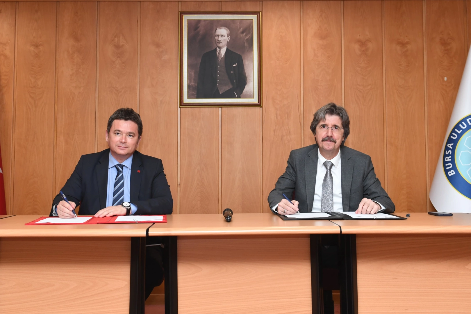 Bursa Uludağ Üniversitesi Rektörlük Binası’nda imzalanan protokolün ardından Osmangazi Belediye Başkanı Erkan Aydın ve Bursa Uludağ Üniversitesi Rektörü Prof. Dr. Ferudun Yılmaz, günün anısına birbirine hediye takdim etti.