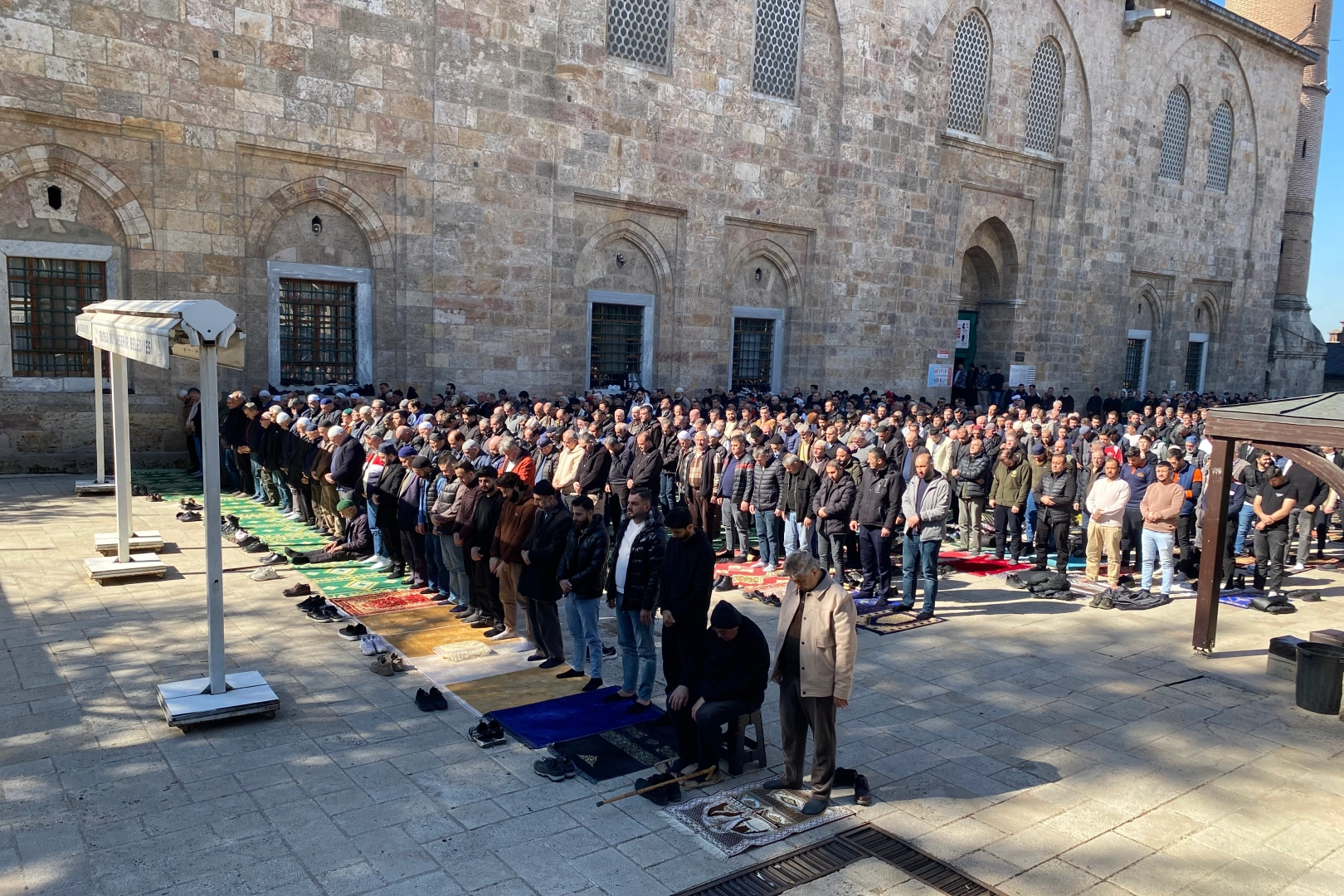 Yoğunluğun yaşandığı anlar havadan drone ile görüntülendi. Havanın sıcak olmasının da etkisiyle çok sayıda vatandaş yanlarında getirdikleri seccadeleri avluya sererken, omuz omuza kılınan cuma namazında birlik ve beraberlik görüntüleri oluştu. Ramazan ayının manevi atmosferi, ilk cuma namazında camilere yansıdı.