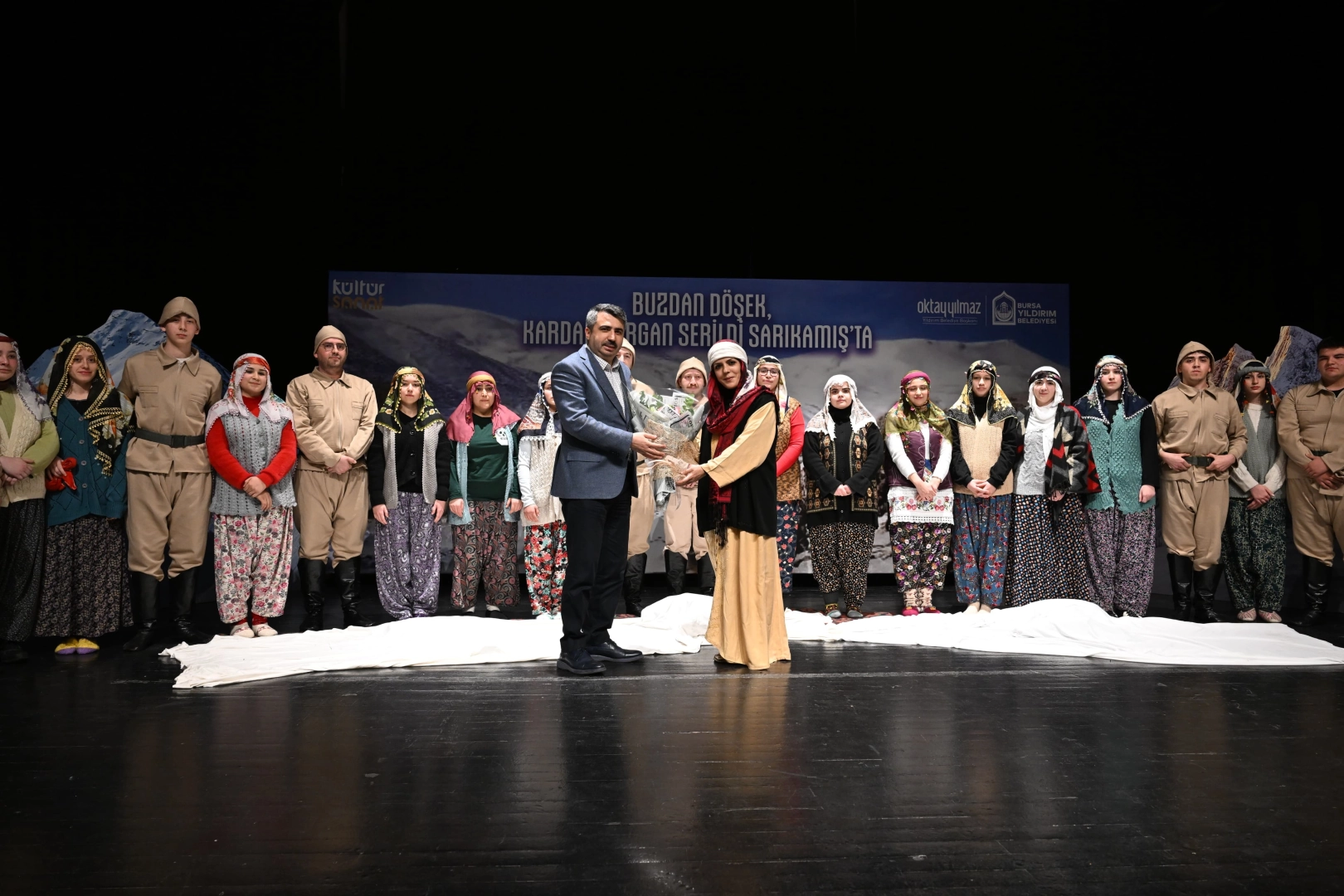 Başkan Yılmaz, tiyatro oyununa katılım gösteren tüm kursiyerlere ve ekibe teşekkür ederek, “Bu topraklarda yazılan destanlar, tarihe altın harflerle kazındı. Bugün, Yıldırım Belediyesi Sahne Sanatları Oyunculuk Atölyesi kursiyerlerimiz tarafından sahnelenen Sarıkamış Kardan Kefen adlı tiyatro oyunu, sadece bir tarih sahnesini değil, aynı zamanda bu milletin düşmanla nasıl mücadele ettiğini de bir kez daha gözler önüne serdi” dedi.Sanatın, bir milletin geçmişini hatırlatmak ve geleceğe doğru güçlü adımlar atmak için en güçlü araçlardan biri olduğunu kaydeden Başkan Yılmaz, “Bu anlamlı tiyatro oyununu hazırlayan Yıldırım Belediyesi Sahne Sanatları Atölyesi kursiyerlerimizi kutluyor, başarılarının devamını diliyorum.