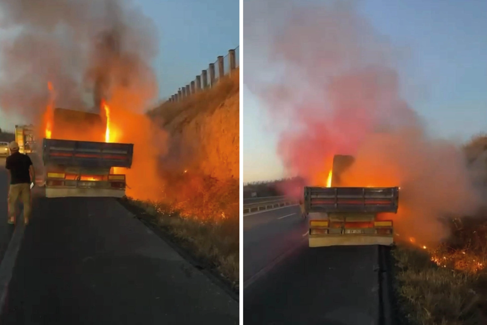 Bursa’nın Mustafa Kemal Paşa ilçesinde sürücüsünün idaresinde olan tırın dorse kısmında bir anda dumanlar yükseldi. Sürücünün durumu fark etmesiyle araç hemen kenarı çekildi. Hızla büyüyen alevler tırdan anayoldaki otluk alana sıçradı. Sürücünün ihbarı üzerine olay yerine itfaiye ekibi sevk edildi. Alev topuna dönen tırı söndüren ekipler yol kenarında otluk alana sıçrayan alevleri de hızla söndürdü. Tırın alev alev yandığı anlar kameraya yansırken, yangında korkulan olmadı. Olayla ilgili tahkikat başlatıldı.