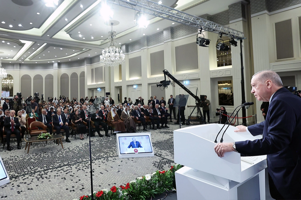 Mazlumların yanında yer almayan bir küresel düzenin, zalimlerin oyuncağı olmaya mahkum olduğunu söyleyen Erdoğan, "Bugün dünya zalim karşısında susan, hatta zulmü alkışlayan bir düzenin esiri olmuştur. Uluslararası hukuk, adaleti tesis etmenin değil, güçlünün gücünü tahkim etmesinin aparatı haline gelmiştir. Hukukun üstünlüğü yerine kişiye ve devlete göre hukuk düzeni hakimdir. Gazze’de uluslararası sistem sınavı kaybetmiştir. Birleşmiş Milletler’den Avrupa Birliği’ne birçok kurum kuruluş, savundukları ilkeleri çiğneme pahasına Gazze’de kötü bir imtihan vermiştir. Elbette başkalarını eleştirirken kendimizi ihmal edemeyiz. Bakın. Üzülerek söylüyorum. İçim kan ağlayarak söylüyorum. İslam dünyası da kendisinden bekleneni maalesef yerine getirememiştir. Şüphesiz çok gayret sarf edildi. Zulmü engellemek için pek çok yol denendi. Diplomasinin bütün imkanları kullanıldı. Toplantılar, zirveler, temaslar gerçekleştirildi. Ama sonuçta Gazze’nin tamamen yıkılmasına, 60 bine yakın Gazzelinin katledilmesine mani olunamadı. Bunun üzerinde hepimizin uzun uzun düşünmesi gerekiyor. Müslümanlar olarak kapsamlı bir muhasebeye ihtiyacımız olduğu açıktır. Tabii burada şu gerçeği de vurgulamak durumundayım. Filistinliler öldürülürken sesleri çıkmayanların, Gazze halkının işgale karşı verdiği direnişe terörizm yaftası vurarak soykırımı normalleştirmeye çalıştıklarını görüyoruz. Türkiye olarak bu iftiraları, bu kara propagandayı reddettiğimizi bugün bir kere çok net biçimde söylemek isterim" diye konuştu.