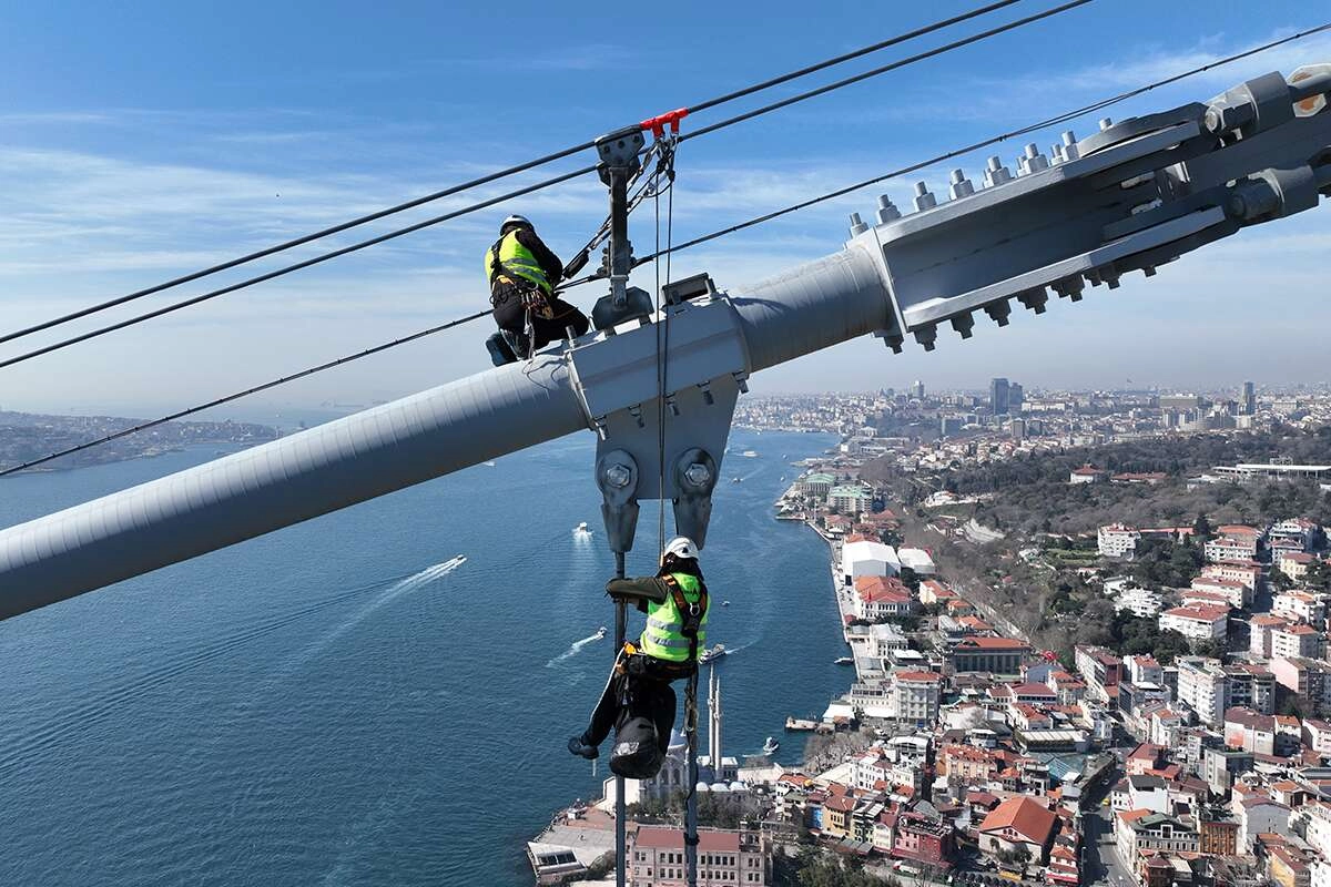 İstanbul'un en gözde yapılarından 15 Temmuz Şehitler Köprüsü üzerinde işçilerin bakım onarım çalışmaları havadan görüntülendi. Köprü üzerindeki çelik halatlardan sarkan işçiler, köprüyü süsleyen ışıklandırma sistemlerinin bakım ve onarım çalışmalarını gerçekleştirdi. Deniz seviyesinden en yüksek noktası 165 metre olan köprünün halatları üzerindeki işçilerin zorlu çalışması havadan çekilen görüntülere yansıdı. Bir işçi çelik halatların üzerinde beklerken, diğeri halatlara bağlanan özel dağcı ekipmanları ile sarkarak ışıkların kablo sistemlerini düzenlediği görüldü. Çalışmalar çerçevesinde daha önce tespit edilen düzgün çalışmayan aydınlatmalar veya aydınlatmaya bağlı kablo sistemleri yenileri ile değiştiriliyor. 15 Temmuz Şehitler Köprüsü özel günlerde farklı renkle ışıklandırılarak güzel bir görüntüye kavuşuyor.
