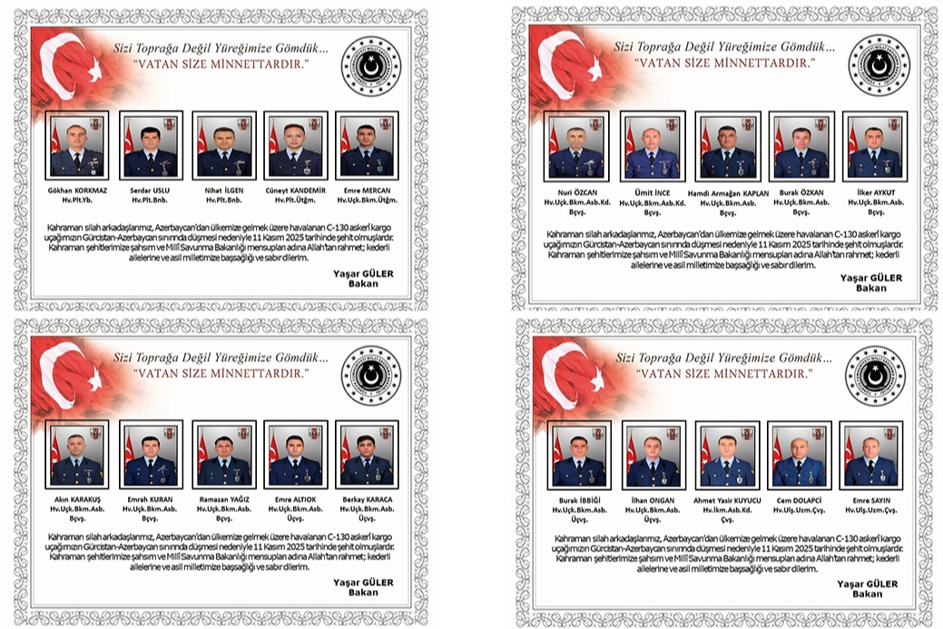 Azerbaycan’dan Türkiye’ye dönmek üzere havalanan C-130 askeri kargo uçağının Gürcistan-Azerbaycan sınırında düşmesi üzerine 20 asker şehit oldu. Şehadete eren askerlerin isimleri ise şu şekilde: "Hava Pilot Yarbay Gökhan Korkmaz, Hava Pilot Binbaşı Serdar Uslu, Hava Pilot Binbaşı Nihat İlgen, Hava Pilot Üsteğmen Cüneyt Kandemir, Hava Uçak Bakım Üsteğmen Emre Mercan, Hava Uçak Bakım Astsubay Kıdemli Başçavuş Nuri Özcan, Hava Uçak Bakım Astsubay Kıdemli Başçavuş Ümit İnce, Hava Uçak Bakım Astsubay Başçavuş Hamdi Armağan Kaplan, Hava Uçak Bakım Astsubay Başçavuş Burak Özkan, Hava Uçak Bakım Astsubay Başçavuş İlker Aykut, Hava Uçak Bakım Astsubay Başçavuş Akın Karakuş, Hava Uçak Bakım Astsubay Başçavuş Emrah Kuran, Hava Uçak Bakım Astsubay Başçavuş Ramazan Yağız, Hava Uçak Bakım Astsubay Üstçavuş Emre Altıok, Hava Uçak Bakım Astsubay Üstçavuş, Berkay Karaca, Hava Uçak Bakım Astsubay Üstçavuş Burak İbbiği, Hava Uçak Bakım Astsubay Üstçavuş İlhan Ongan, Hava İkmal Astsubay Kıdemli Çavuş Ahmet Yasir Kuyucu, Hava Ulaştırma Uzman Çavuş Cem Dolapci, Hava Ulaştırma Uzman Çavuş Emre Sayın."