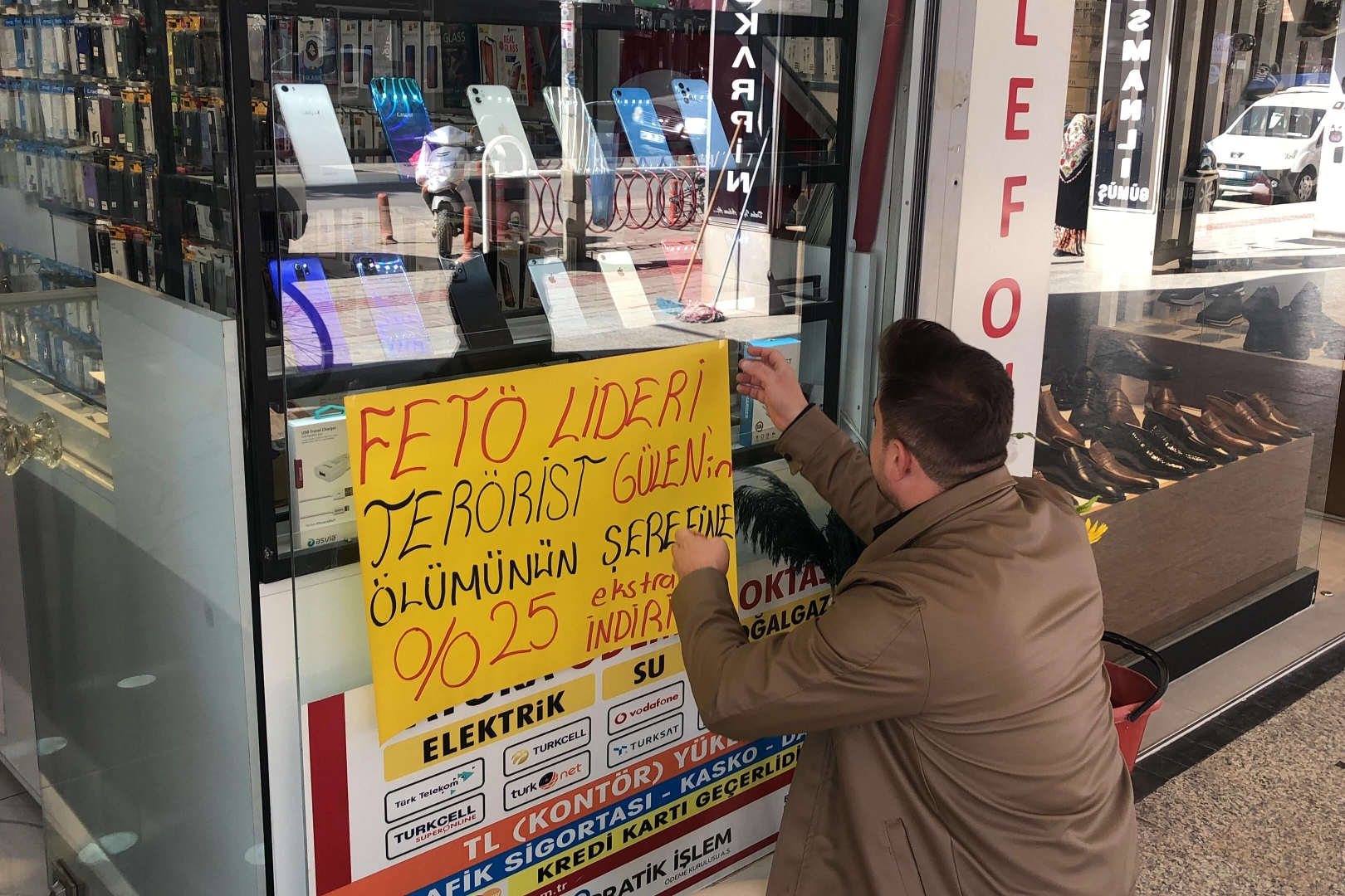İnegöl Bayrak Telekom Teknik Servis işletmecisi Süleyman Bayrak, işyerinin camına "FETÖ lideri terörist elebaşı Gülen'in ölümünün şerefine yüzde 25 ekstra indirim" yazısını astı. Açıklama yapan Süleyman Bayrak, "Bugün güzel bir haber aldık.