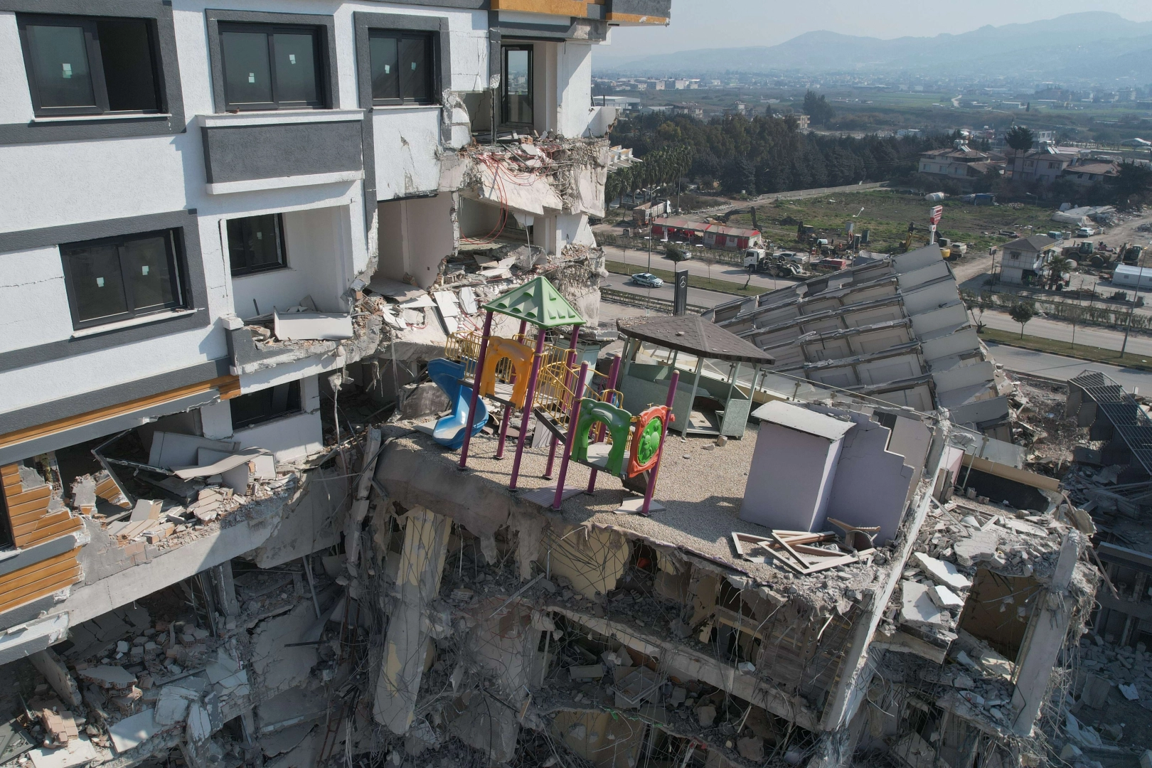 Hatay'da deprem sırasında çökme meydana gelen bir binada, zemin kat kolonlarının havuz yapılacağı gerekçesiyle kesildiği iddia edildi. Aynı binanın teras katında ise çocuk oyun parkı olduğu görüldü. Enkaza dönüşen binada çok sayıda kişi hayatını kaybetti. Yıkılan bina dron ile görüntülendi.