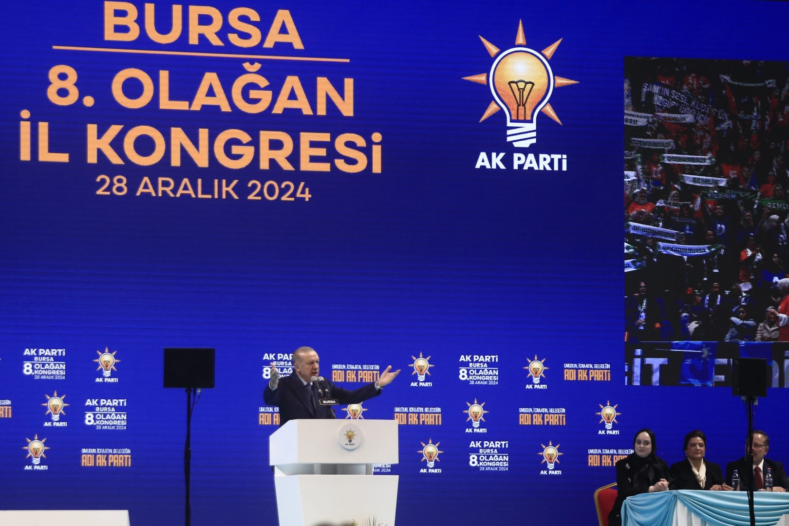 Cumhurbaşkanı Recep Tayyip Erdoğan, partisinin 8. olağan kongresinde Tofaş Spor Salonu'nda konuştu. Bursa'yı tüm ihtişamı ile tekrar ayağa kaldırmak için ulaşımdan enerjiye, çevre ve şehircilikten sağlığa kadar önemli yatırımlar yapıldığını ifade eden Erdoğan, şunları söyledi: "Adalette 6 milyar, eğitimde 60 milyar, gençlik ve sporda 7 milyar, sosyal yardımlarda 97 milyar lira, sağlıkta 23 milyar lira, çevre ve şehircilikte 124 milyar liralık hizmeti şehrimize kazandırdık. Ulaştırmada 230 milyar lira, tarım ve ormanda hibe destekleri dahil 60 milyar lira, sanayi ve teknolojide 3 milyar lira, enerjide kamu ve özel toplam 124 milyar lira, kültür ve turizmde 3 milyar lira, çalışma ve sosyal güvenlikte teşviklerle toplam 28 milyar lira yatırım yaptık. Bursa'da 2. devlet üniversitesi olarak Bursa Teknik Üniversitesini devreye aldık. 43 bin kişilik stadyumla 86 spor tesisi inşa ettik. Bursaspor iyi gidiyor, taraftarlarıyla muhteşem birliktelik yakaladı. Bu birliktelik sayesinde Bursaspor namağlup şekilde ilk devreyi tamamladı.