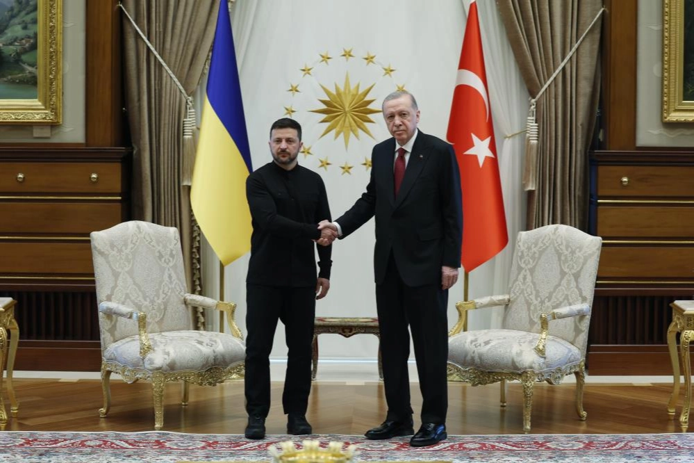 Cumhurbaşkanı Erdoğan, Zelenskiy'i Cumhurbaşkanlığı Külliyesi giriş kapısında karşıladı. Erdoğan ve Zelenskiy, merdivenlerde Türk ve Ukrayna bayrakları önünde fotoğraf çektirdi.