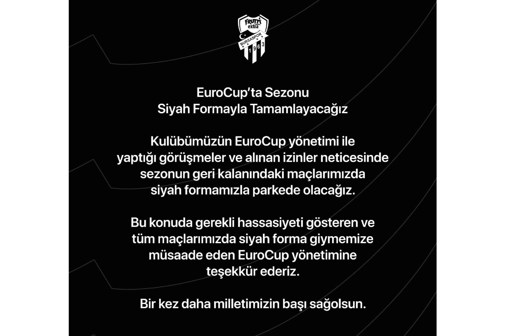 EuroCup’ta Türkiye’yi temsil eden Bursaspor, EuroCup yönetimiyle yaptığı görüşmeler neticesinde, Kahramanmaraş’ta meydana gelen ve 10 ili etkileyen depremlerin ardından hayatını kaybeden vatandaşların anısına sezonun geri kalanında siyah formayla parkeye çıkacaklarını duyurdu. Kulübün sosyal medya hesabından yapılan açıklamada, "Kulübümüzün EuroCup yönetimi ile yaptığı görüşmeler ve alınan izinler neticesinde sezonun geri kalanındaki maçlarımızda siyah formamızla parkede olacağız. Bu konuda gerekli hassasiyeti gösteren ve tüm maçlarımızda siyah forma giymemize müsaade eden EuroCup yönetimine teşekkür ederiz. Bir kez daha milletimizin başı sağ olsun" ifadeleri kullanıldı.