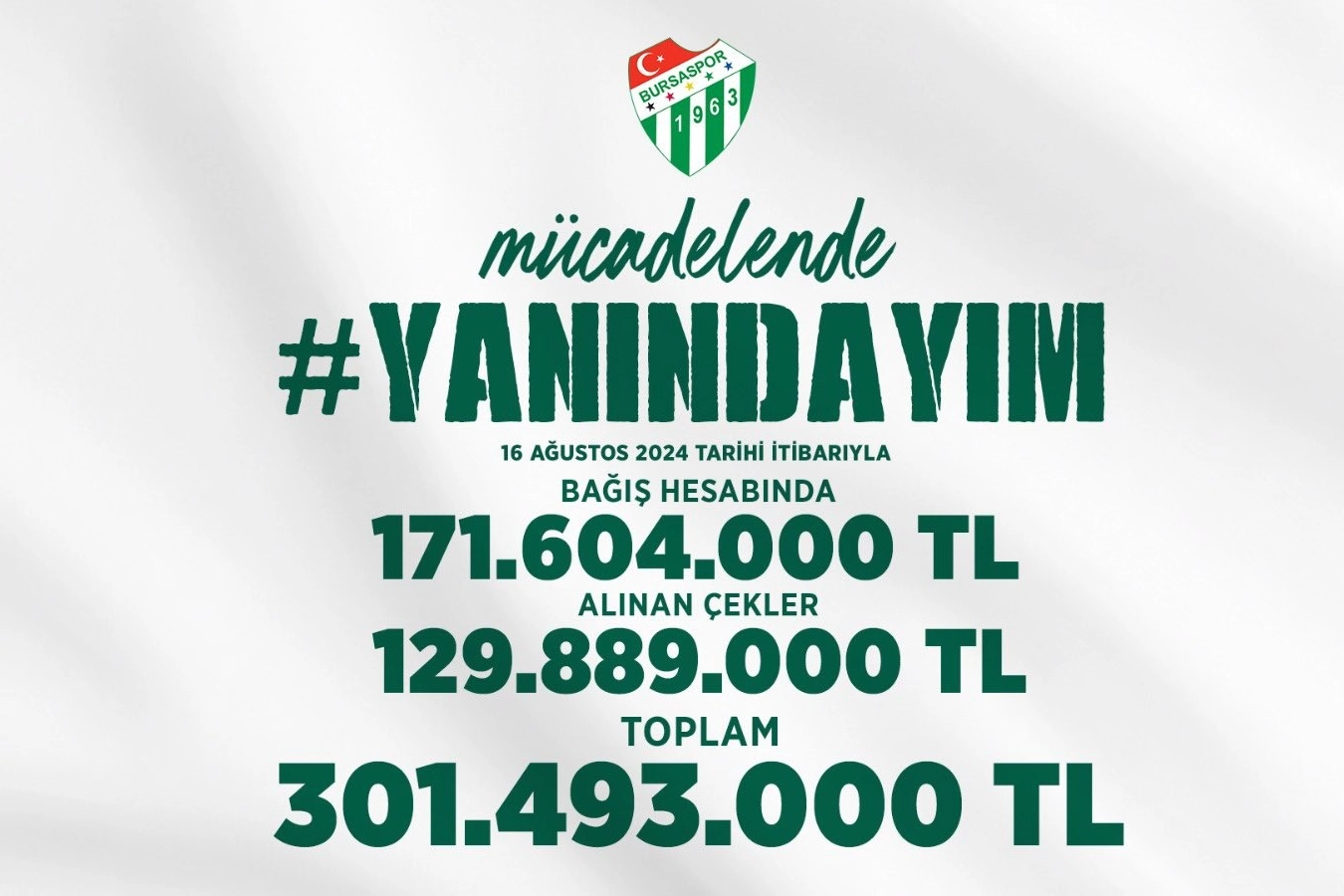 Bursaspor Kulübü, ‘Yanındayım' kampanyası için toplanan son rakamı açıkladı. Yeşil-beyazlı kulüp, kampanyaya yapılan bağışların 301 milyon 493 bin TL’ye ulaştığını kamuoyu ile paylaştı. 2009-2010 sezonunda Süper Lig şampiyonu olan ancak sonrasında kötü yönetimlerin başa geçmesi ve beraberinde gelen maddi zorluklar sebebiyle TFF 3. Lig’e kadar düşen Bursaspor, yeniden ayağa kalkması için Türkiye’de eşine zor rastlanır bir kampanyaya imza atıyor. Bursaspor Kulübü’nün bu kampanyası tüm hızıyla da devam ediyor.
