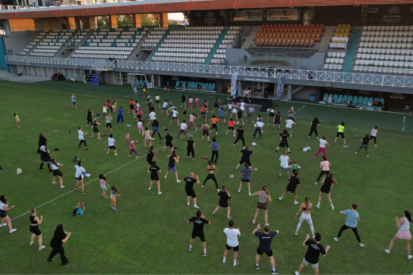Nilüfer Belediyesi’nin, “Sporla Zinde Kal” sloganıyla düzenlediği etkinlikler ile her yaştan Nilüferli sporla buluştu. İbrahim Yazıcı Stadyumu'nda gerçekleştirilen etkinliklerde katılımcılar, bir ay boyunca eğitmenler eşliğinde yoga ve zumba atölyeleriyle hem stres attı hem de spor yaptı. Nilüfer Belediyesi’nin yaz mevsimi ile açık havaya taşınan spor etkinlikleri yoğun bir ilgiyle gerçekleştirildi. Duygu Göktaş eğitmenliğinde düzenlenen zumba atölyesine 5 hafta boyunca yaklaşık bin kişi katıldı. Atölyenin son gününün sürpriz konukları ise Nilüfer Belediyespor Kulübü Kadın Voleybol Takımı oldu. Zumba atölyesine katılan voleybolcular, Nilüferliler ile birlikte keyifli vakit geçirdi. İbrahim Yazıcı Stadyumu’nda ücretsiz olarak gerçekleştirilen spor etkinlikleri perşembe günleri yoga ile devam edecek.