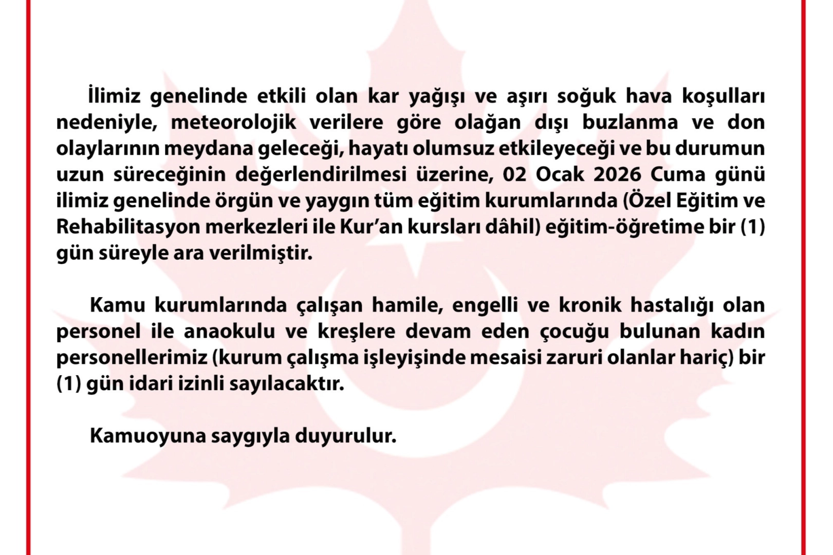 Bursa Valiliğinden yapılan açıklamada, "İlimiz genelinde etkili olan kar yağışı ve aşırı soğuk hava şartları sebebiyle, meteorolojik verilere göre olağan dışı buzlanma ve don olaylarının meydana geleceği, hayatı olumsuz etkileyeceği ve bu durumun uzun süreceğinin değerlendirilmesi üzerine, 2 Ocak 2026 Cuma günü ilimiz genelinde örgün ve yaygın tüm eğitim kurumlarında (Özel Eğitim ve Rehabilitasyon merkezleri ile Kur’an kursları dahil) eğitim-öğretime 1 gün süreyle ara verilmiştir. Kamu kurumlarında çalışan hamile, engelli ve kronik hastalığı olan personel ile anaokulu ve kreşlere devam eden çocuğu bulunan kadın personellerimiz (kurum çalışma işleyişinde mesaisi zaruri olanlar hariç) 1 gün idari izinli sayılacaktır" denildi. Meteoroloji tarafından verilen bilgilendirmede ise, saat 21.00'de eksi 7 derece olarak ölçülecek hava sıcaklığının, saat 03.00 ile 06.00 arasında ise eksi 9 olmasının beklendiği ifade edildi.