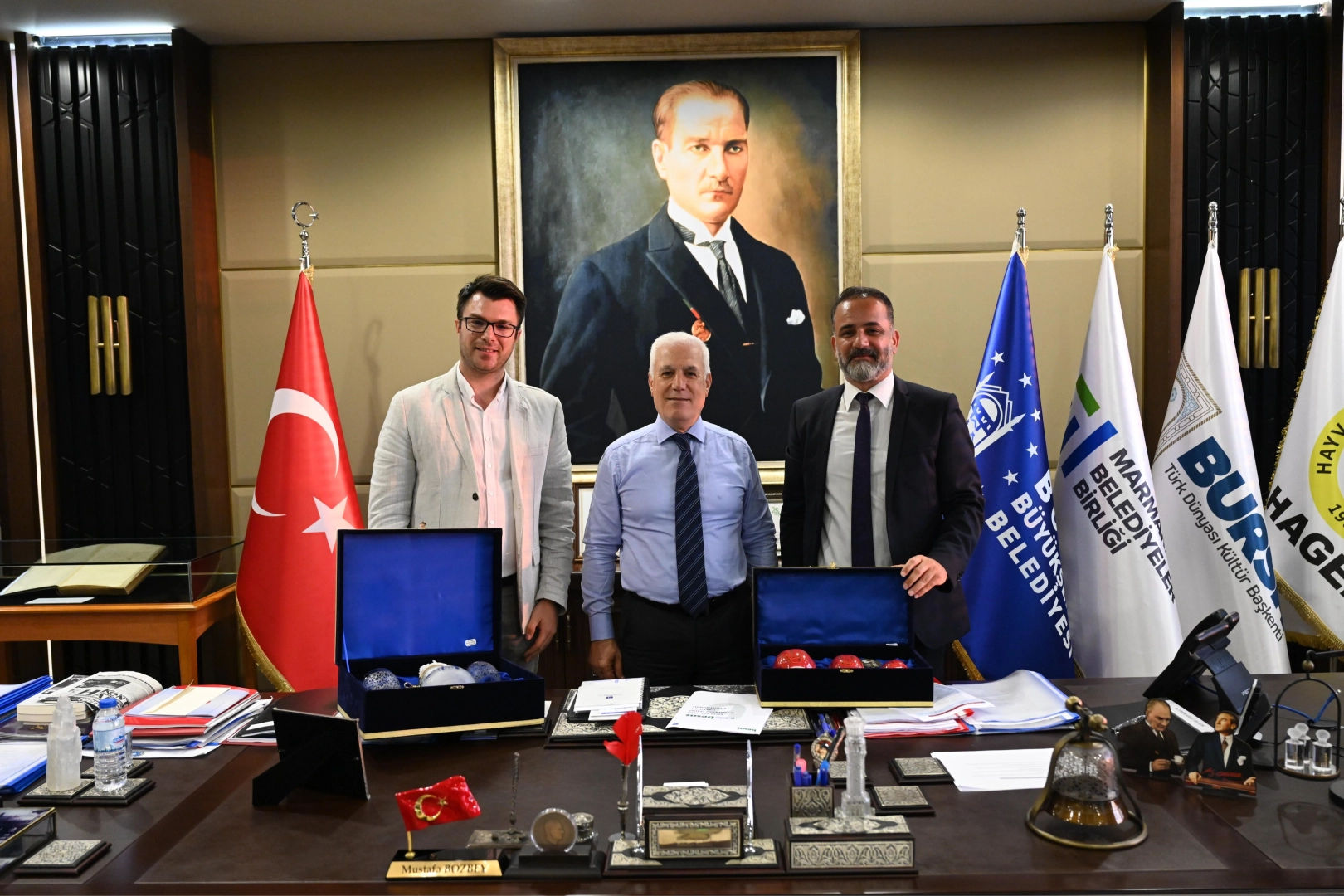 Bursa'nın kültürel mirasını ve sanat yaşamını zenginleştirmek amacıyla faaliyet gösteren Bursa Büyükşehir Belediyesi iştiraklerinden Bursa Kültür AŞ’de yeni dönemde yapılacak proje ve etkinliklere yönelik hazırlıklar sürüyor. Bursa Kültür AŞ Yönetim Kurulu Başkanı Yücel Akbulut ve Genel Müdür Yankı İçöz, Bursa Büyükşehir Belediye Başkanı Mustafa Bozbey ile makamında bir araya geldi. Bursa Kültür AŞ’nin yeni dönemde önemli işlere imza atacağını söyleyen Başkan Mustafa Bozbey, “Bursa’nın kültürel zenginliğini daha da artıracak ve halkımızın sosyal yaşamına önemli katkılar sağlayacağız. Bursa Kültür AŞ'nin ürettiği projeleri ve çalışmalarını memnuniyetle destekliyorum. Hep birlikte şehrimizi daha da güzelleştireceğiz” dedi. Bursa Kültür AŞ Yönetim Kurulu Başkanı Avukat Yücel Akbulut ise Bursa'nın kültürel dokusunu yapacakları çalışmalarla güçlendireceklerini belirterek, “Başkanımız Mustafa Bozbey'in desteğiyle, şehrimize yakışır projelere imza atacağız” diye konuştu. Şirketin yeni dönem işleyişi ve projeleri hakkında Başkan Bozbey’e bilgi veren Bursa Kültür AŞ Genel Müdürü Yankı İçöz ise, “Kültür ve sanatın her dalında öncü olacağız. Şehrimizin kültürel değerlerini koruyarak, genç nesillere ilham verecek bir kültürel dönüşüm için kolları sıvadık. Var gücümüzle çalışıyoruz. Sosyal eğitim faaliyetlerine önem veriyoruz. Bale ve dans kurslarını da yakın zamanda başlatacağız. Kentin turizm pastasından daha fazla pay alabilmesi için nitelikli projeler geliştiriyoruz. Bursa’yı uluslararası arenada tanıtacak çok özel çalışmalarımız olacak” dedi.
